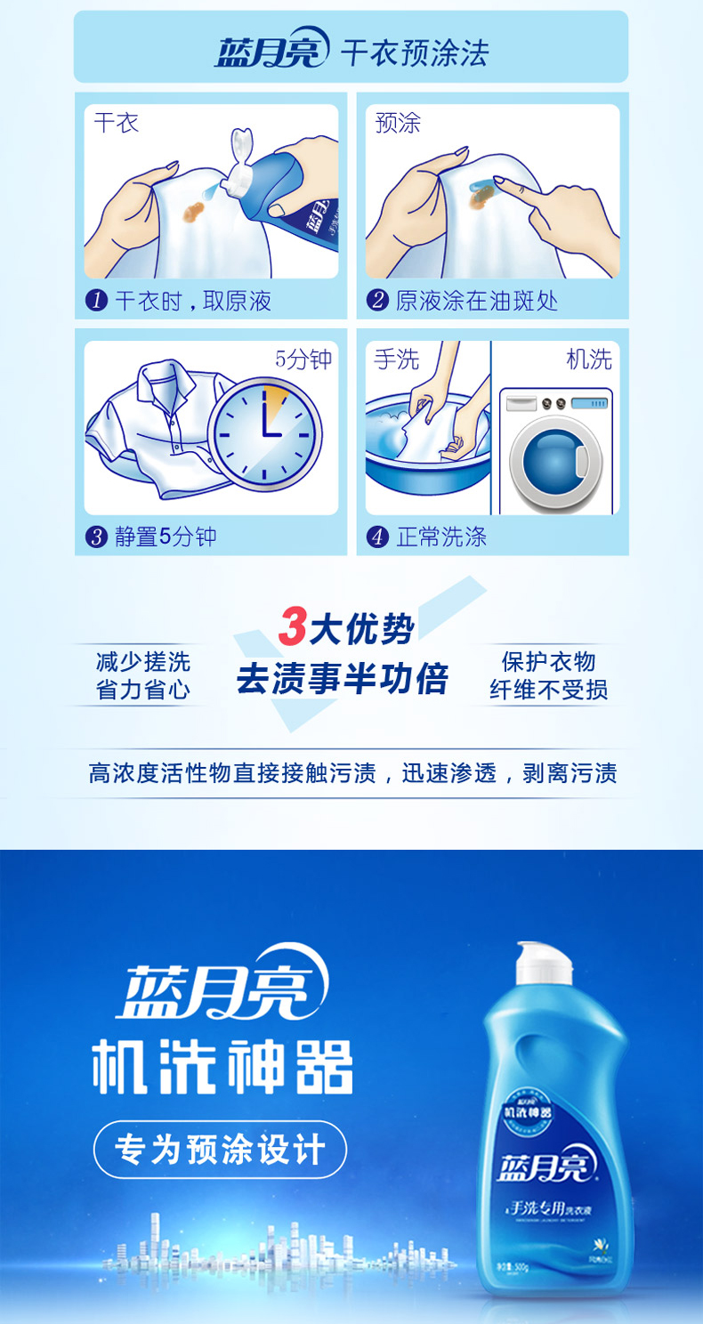 蓝月亮洗衣液是中国洗衣液市场的领导品牌,蝉联八届洗衣液冠军,2010年市场份额高达44%。2008年推出的深层洁净洗衣液引爆了中国洗衣液市场;2010年针对衣物色彩的护理推出亮白增艳洗衣液,2011年在中国抢先推出首款手洗专用洗衣液,掀起了衣物手洗新风尚。