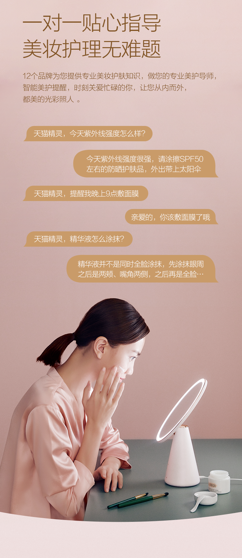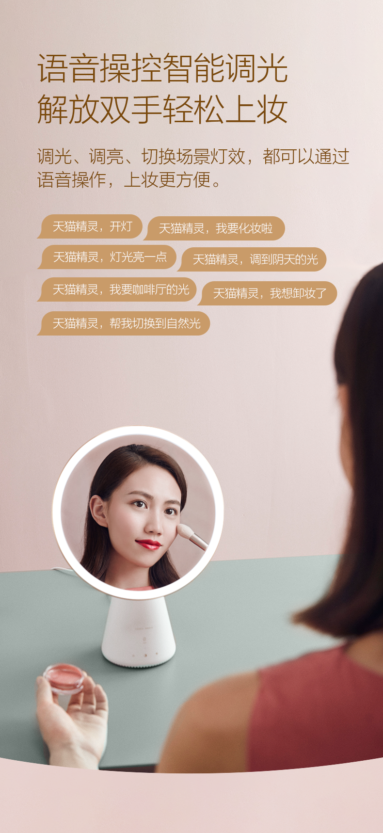 天猫精灵 QUEEN 智能美妆镜,采用经典几何造型,曲面优美,8英寸高清抗污镜面,专业美妆级光源,模拟自然光源、还原准确妆容。智能语音无级调节亮度,镜面角度自由调节,还可学习化妆护理知识,美护提醒,时刻关爱,女神之选。