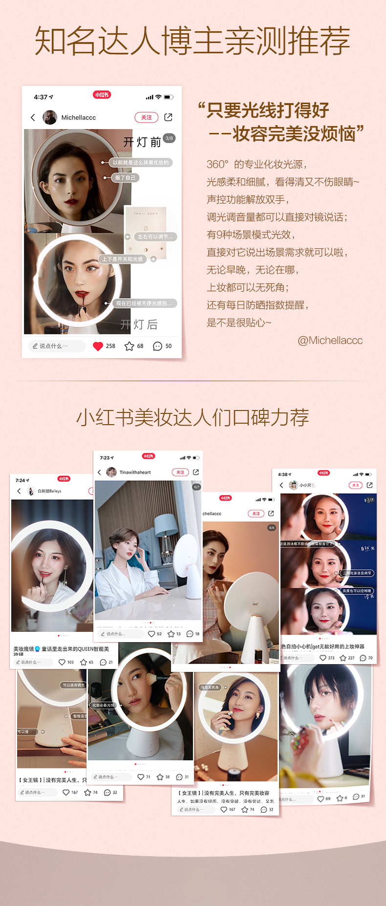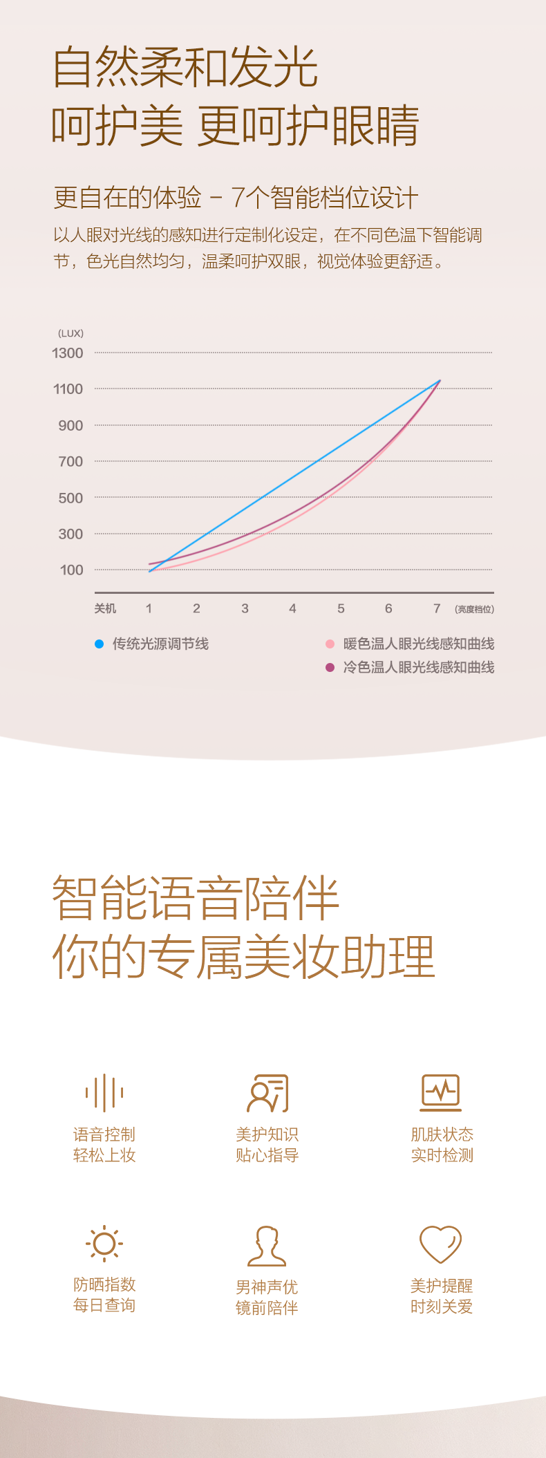采用64颗专业美妆级灯珠,其中32颗冷光+32颗暖光交叉分布,显色指数高达97,亮度高达1100lux媲美日光,呈现高清的自己;全光谱采用LED光源,还原真实色彩,光线不刺眼,环形导光圈采用散射柔光技术,确保每寸肌肤都被均匀照射,上妆更轻松无死角。
