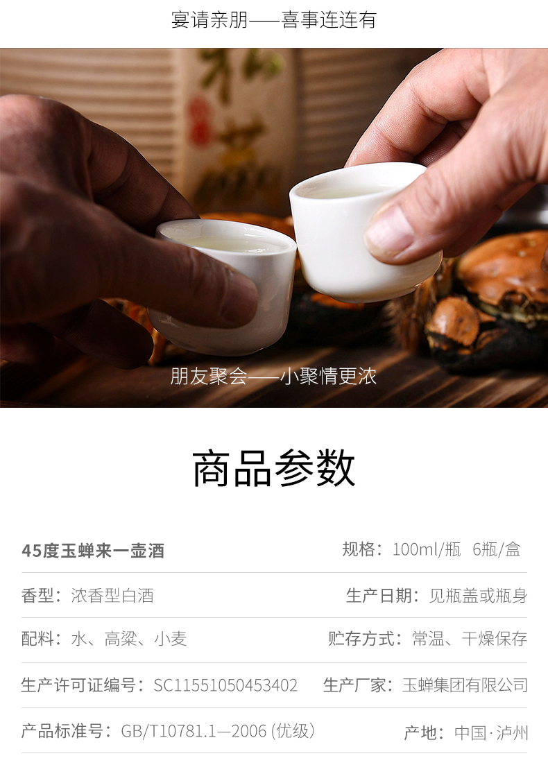 此款玉蝉来一壶,采用优质红高粱、小麦为原料,纯粮酿造,采用10年以上基酒勾兑,45°绵柔浓香,中度不刺激,口感更柔和,酒体丰满,口感绵甜,回味悠长,二两小酒版,畅饮更尽兴。