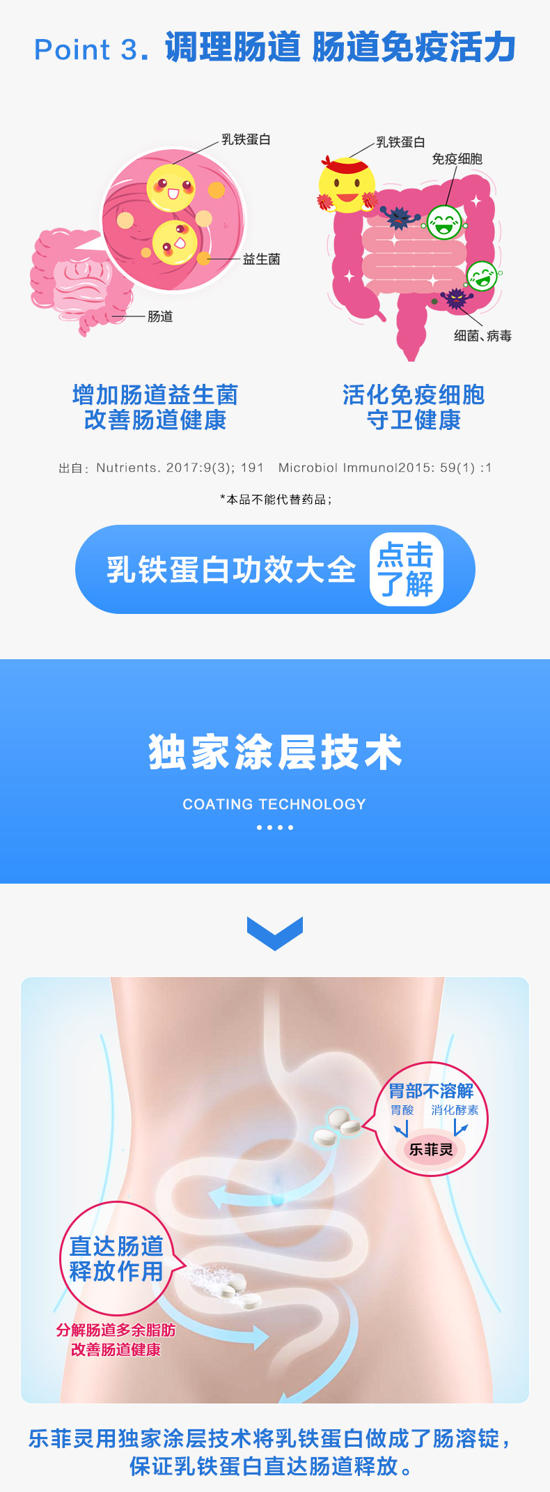 “乳铁蛋白”为日本狮王率先发现实验证明,并通过独特技术独立研发制成了“乐菲灵”。一般情况下,即使摄入了,也会被胃酸和消化酵素在到达肠道之前就会被分解掉,狮王采用其独家涂层技术,保证乳铁蛋白在胃酸中不被溶解,成功送达肠道,针对肠道周围脂肪细胞,并作用内脏脂肪细胞,促进分解,并抑制合成。