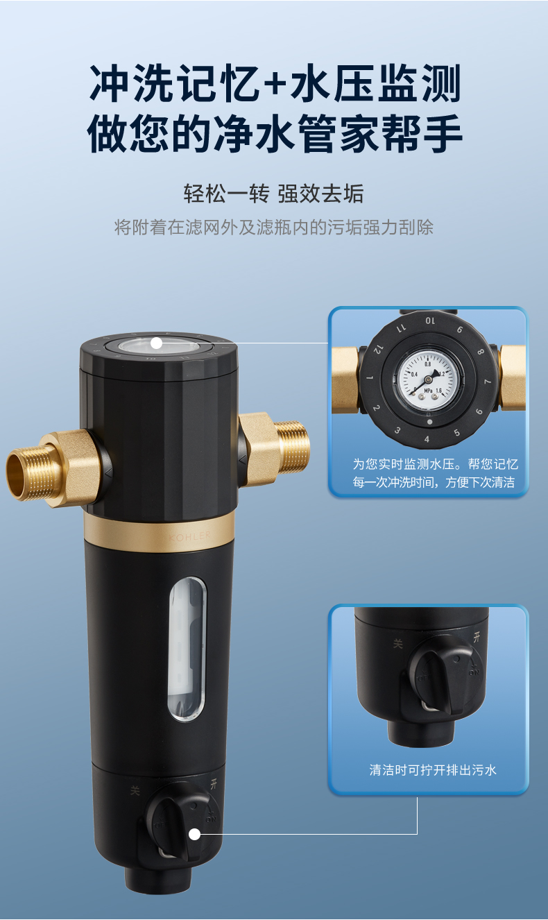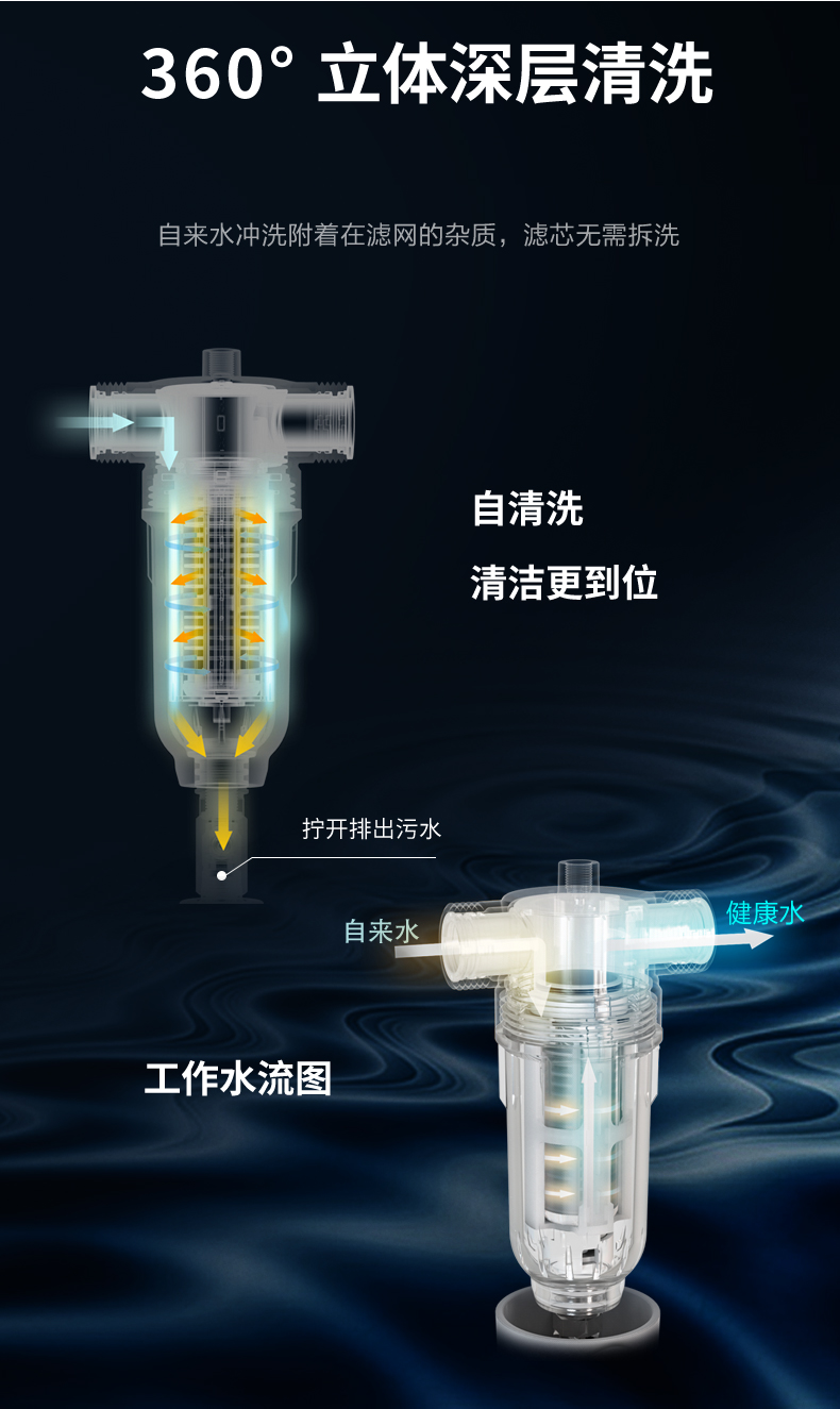具备冲洗清洁功能,虹吸反冲洗系统+双面摩刮,可快速解决滤网污染堵塞问题,强力排污,用水更放心。