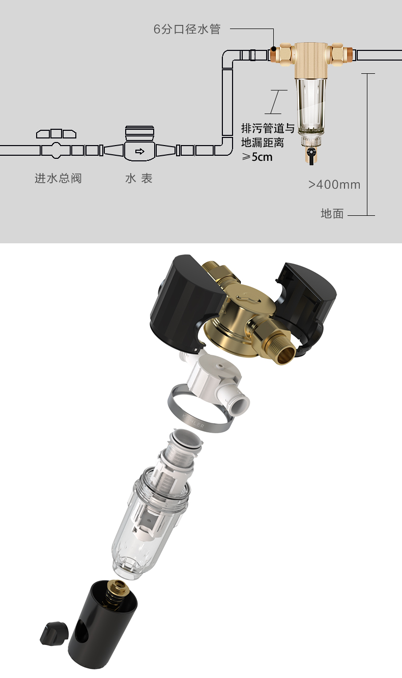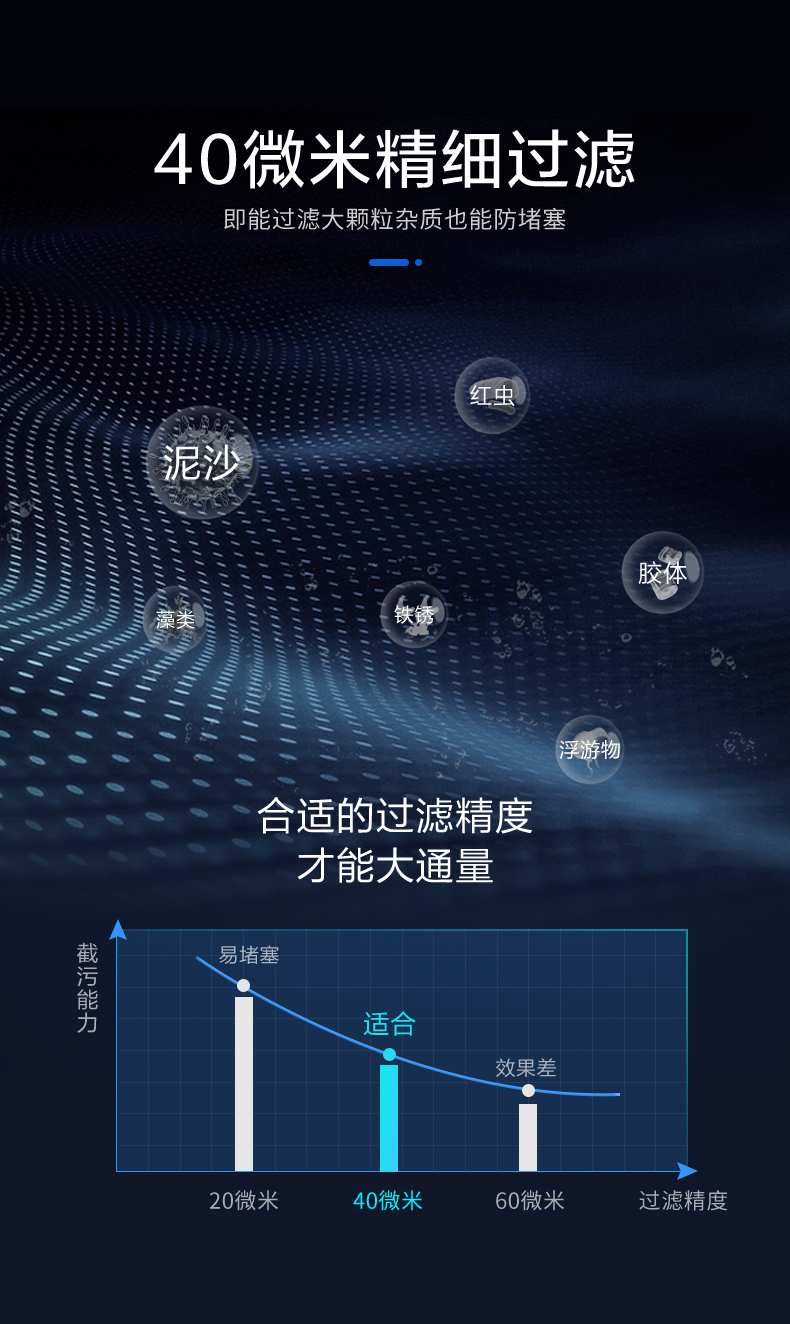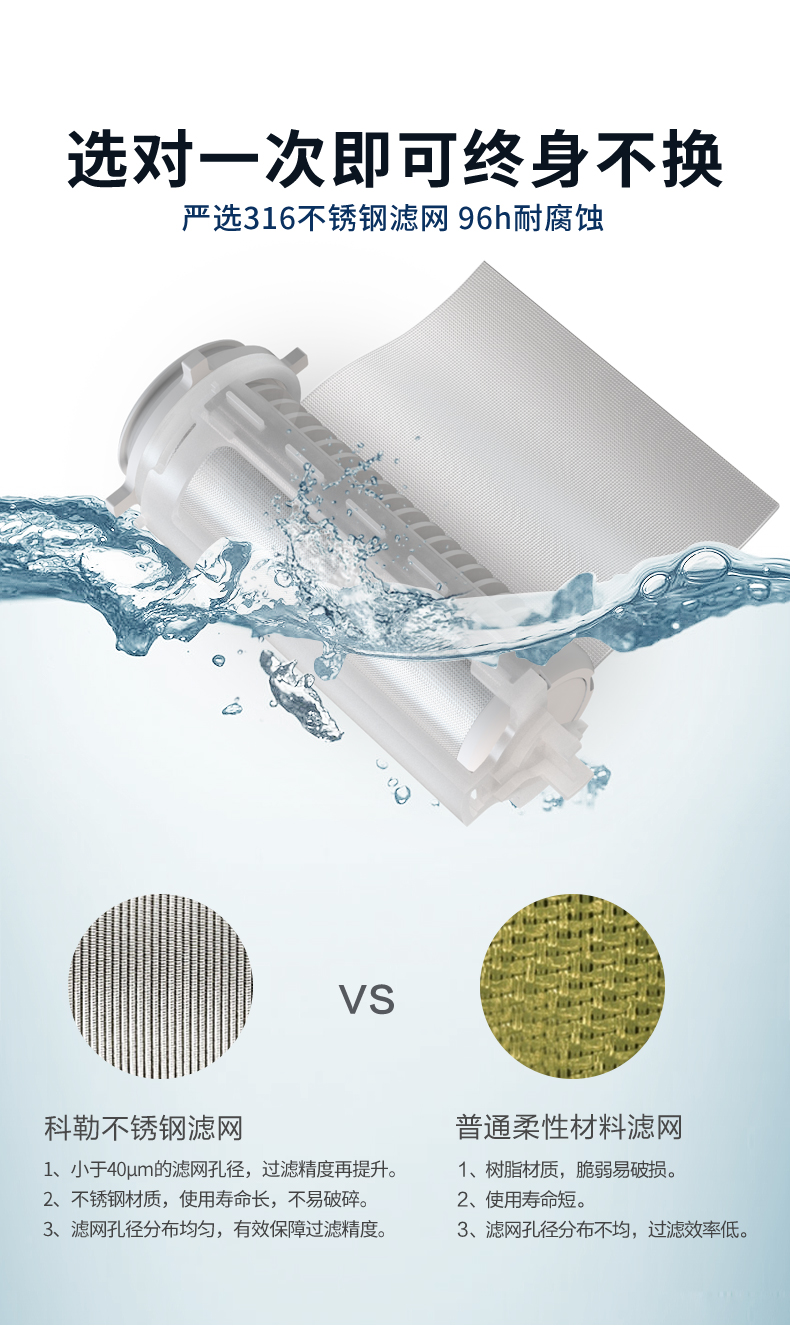 40微米精度316不锈钢滤网,有效去除水中泥沙、铁锈、胶体、藻类、浮游物。红虫等杂质,为居家用水设备提供保护,延长电器使用寿命;