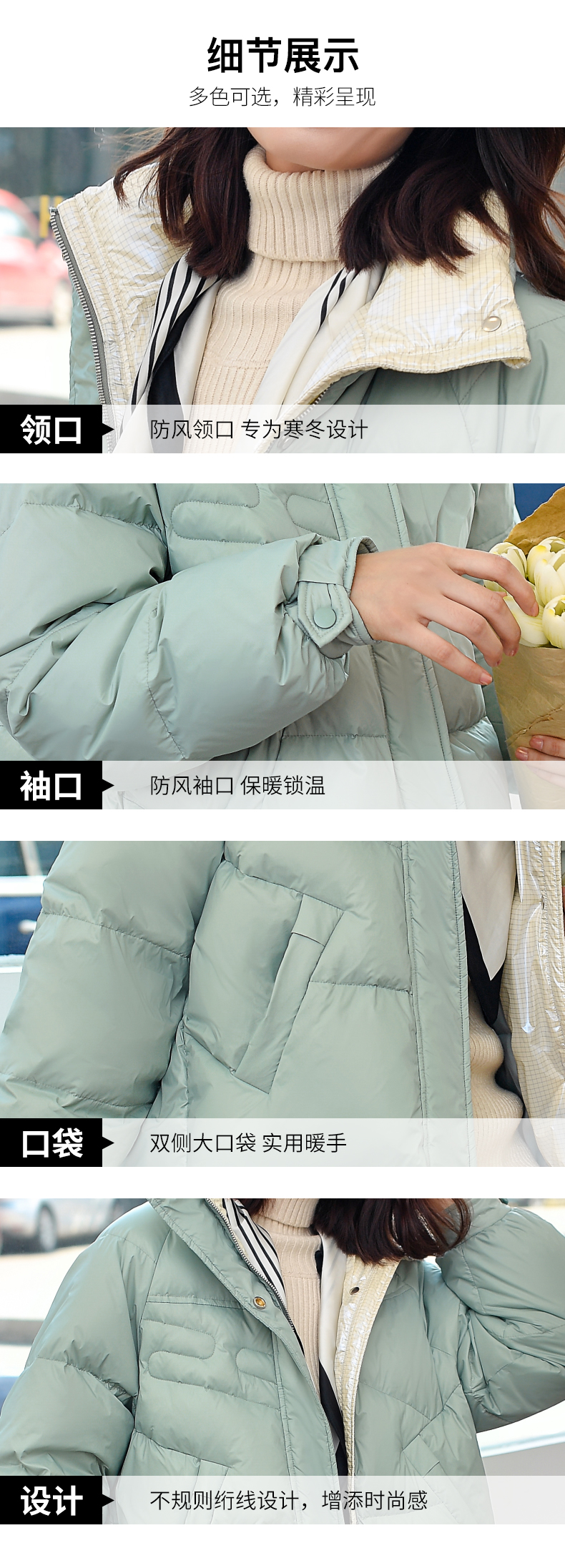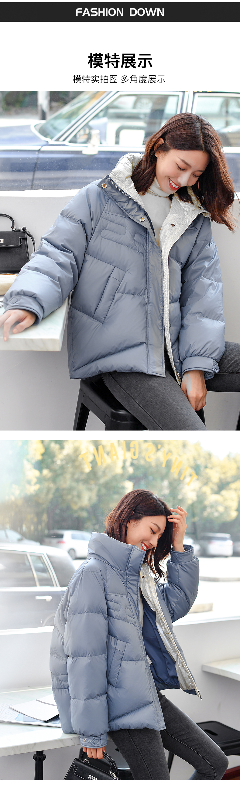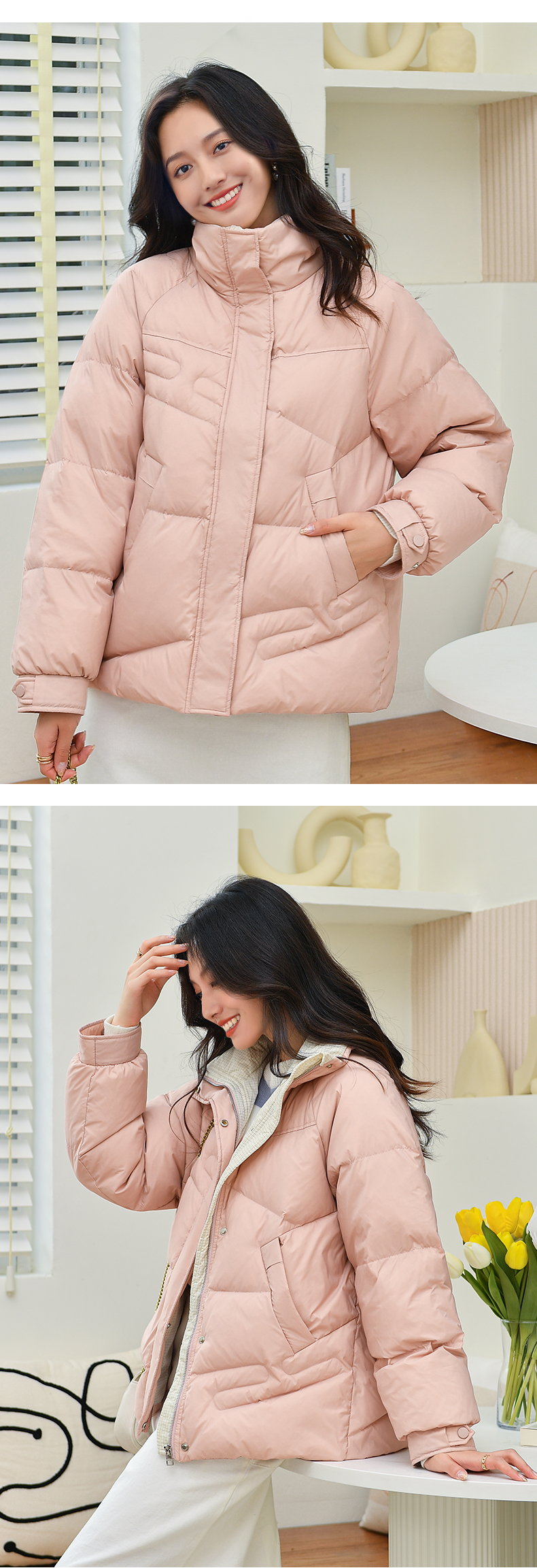 时尚短款面包服,90%白鸭绒填充,高蓬松度,轻薄保暖,双层内胆,高密里料,分格填充,充绒均匀、不跑绒,外层面料100%聚酯纤维,高支高密,抗风防雨,加高立领设计,时尚有型。