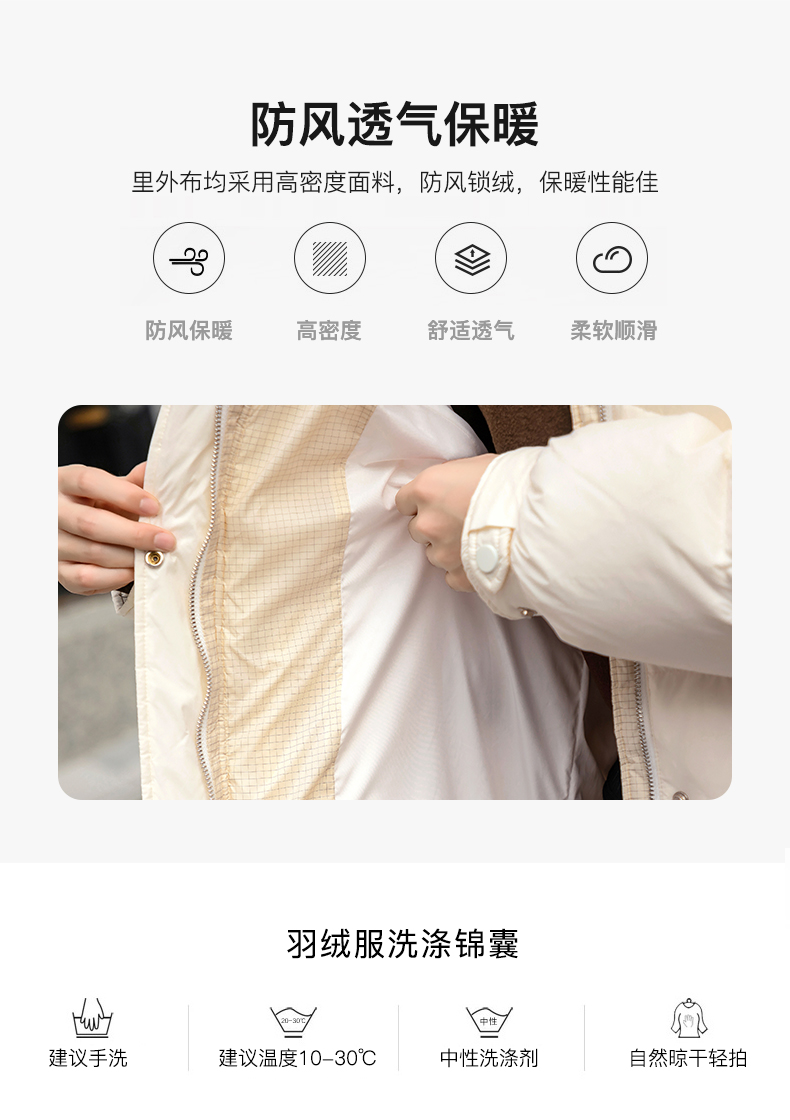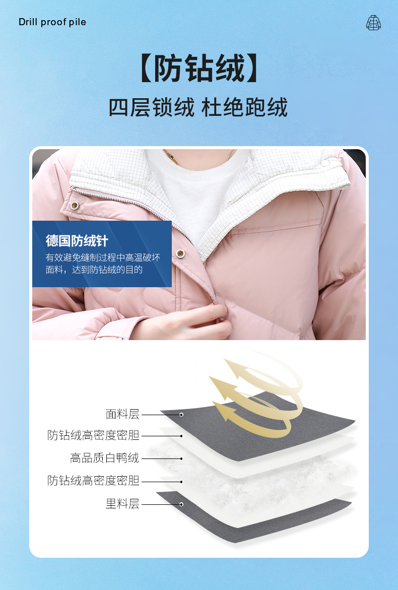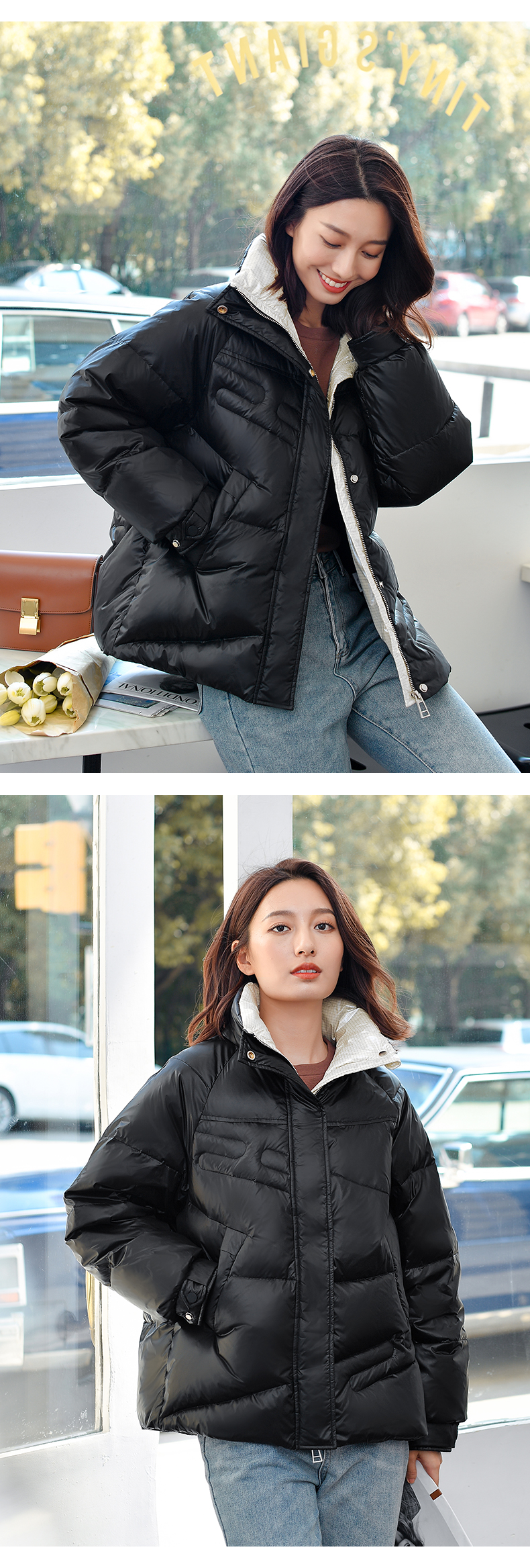 时尚短款面包服,90%白鸭绒填充,高蓬松度,轻薄保暖,双层内胆,高密里料,分格填充,充绒均匀、不跑绒,外层面料100%聚酯纤维,高支高密,抗风防雨,加高立领设计,时尚有型。