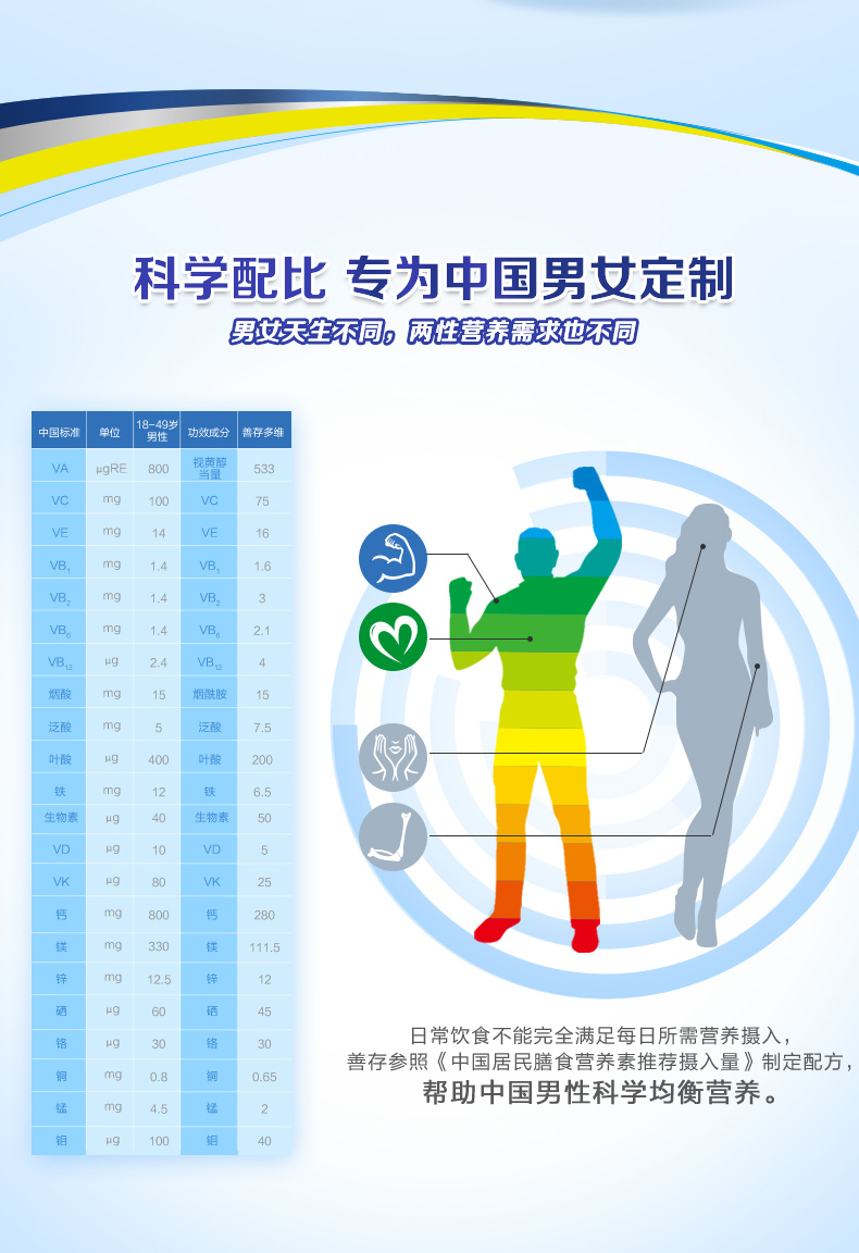这款善存 男女 R多维复合维生素,根据中国成年男女两性营养需求定制,复合22种维生素和矿物质,帮助弥补膳食营养摄入不足,特别加强了B1、B2、B6、烟酰胺、锌五种元素,日常一粒便可满足日常所需,规格是80片/瓶、注:17岁以下、孕妇、乳母不适合。