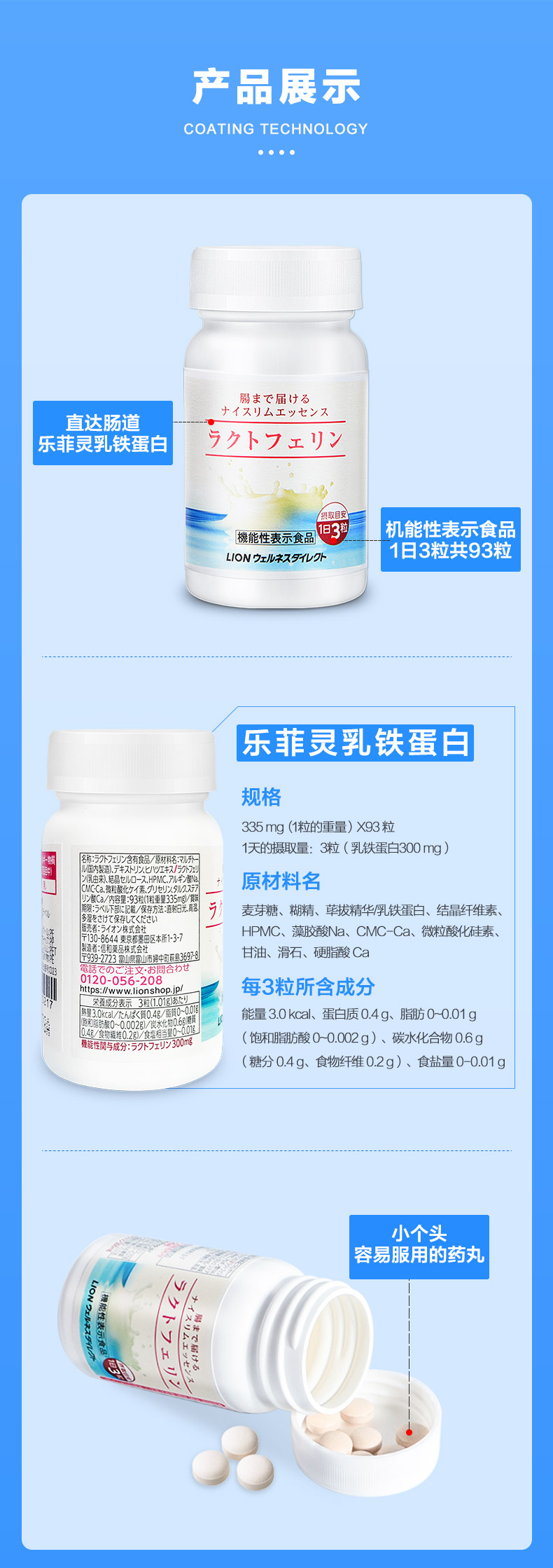 “乳铁蛋白”为日本狮王率先发现实验证明,并通过独特技术独立研发制成了“乐菲灵”。一般情况下,即使摄入了,也会被胃酸和消化酵素在到达肠道之前就会被分解掉,狮王采用其独家涂层技术,保证乳铁蛋白在胃酸中不被溶解,成功送达肠道,针对肠道周围脂肪细胞,并作用内脏脂肪细胞,促进分解,并抑制合成。