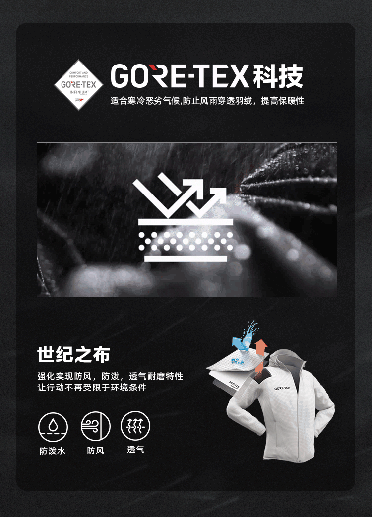 外层GORE-TEX面料,具有持久防风、防泼水性能,同时具备出色的透湿性,锁温保暖,相比一般户外面料性能更佳,而且结实耐磨,穿着更舒适。