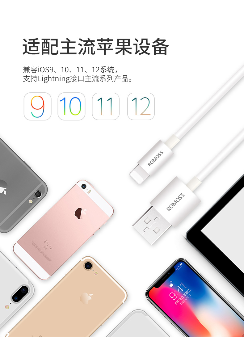 这款罗马仕 Lighting 数据线,线长1m,兼容IOS 9、10、11、12系统,内里是优质纯铜芯,能有2A电流,充电会更快。内置智能芯片可以从急速闪充到涓流充电,还能根据手机电池容量大小,自动调节输入电量的大小,保护电池。