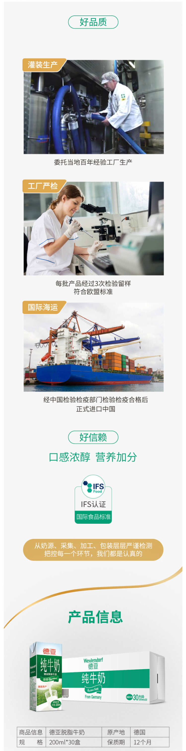 这款德亚牛奶由德国知名奶产品厂商Hochwald 好沃德代工生产,商品拥有国家颁发的“出入境检验检疫卫生证书”和“中国人民共和国进口货物报关单”。