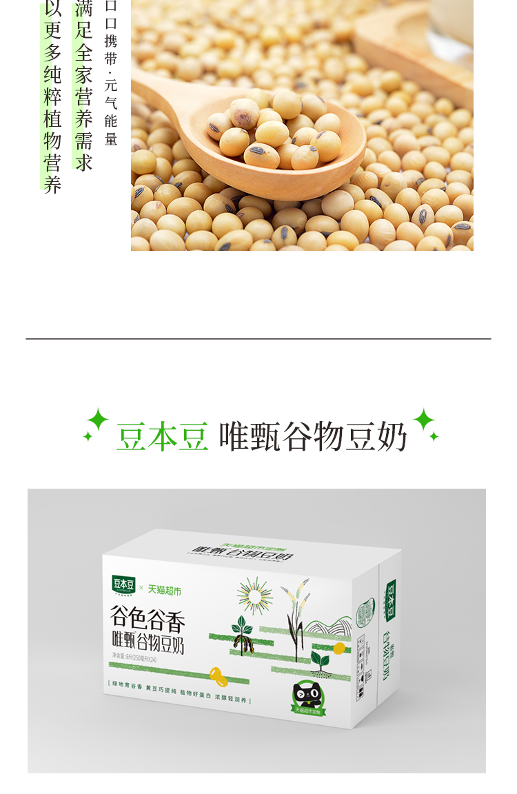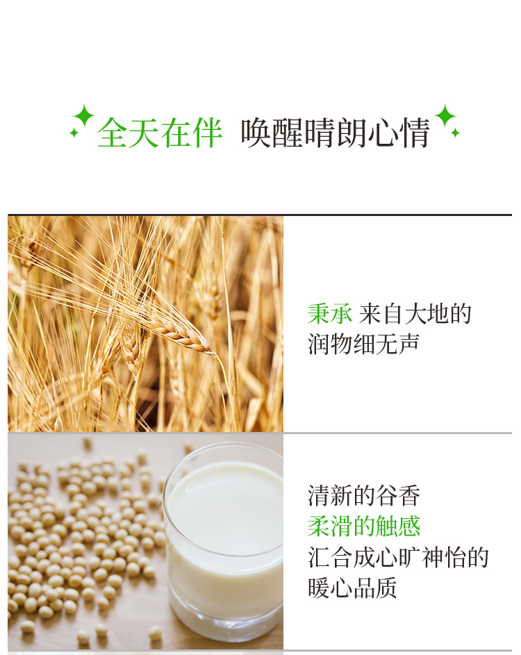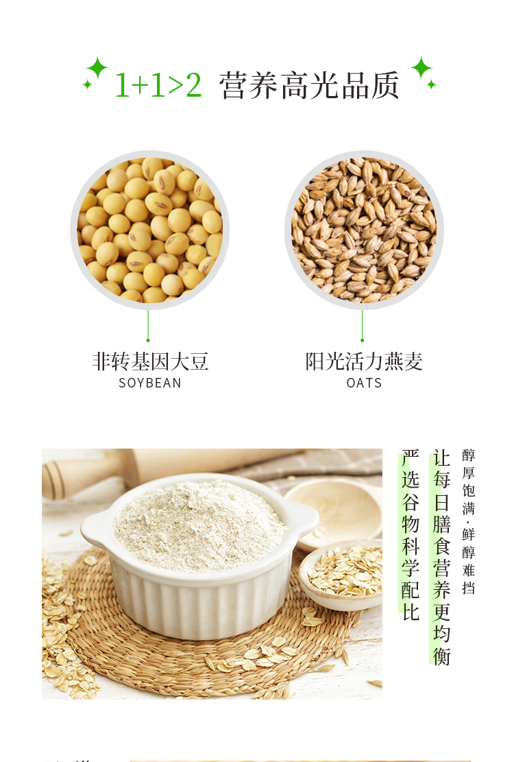 严选非转基因大豆和阳光燕麦为原料,精磨技术科学配比,口感丝滑醇厚,豆香浓郁,富含天然植物蛋白,营养更纯粹。因为添加了阳光燕麦,相比纯粹的豆香还多了一重麦香,甜润生津,营养更丰富,日常可冷饮。可热饮用。搭配早餐居家必备。