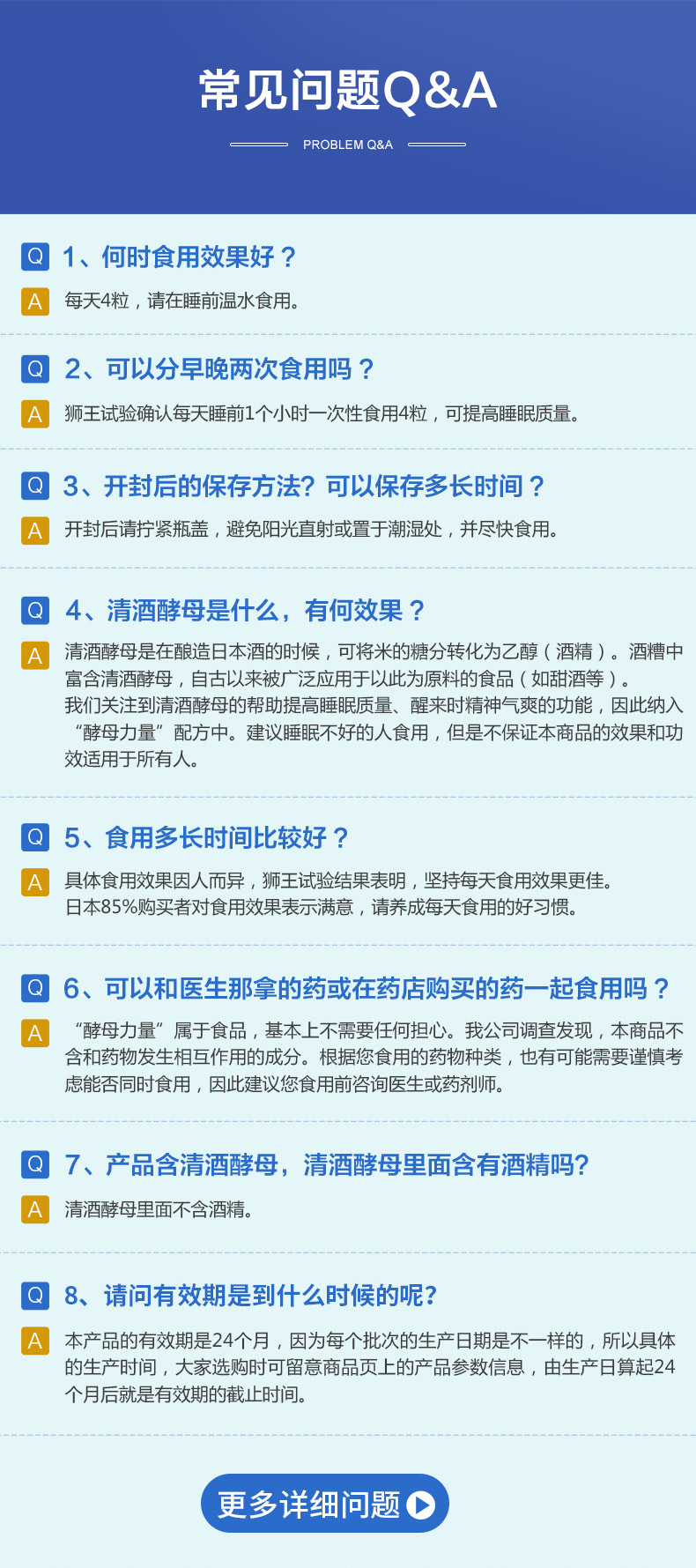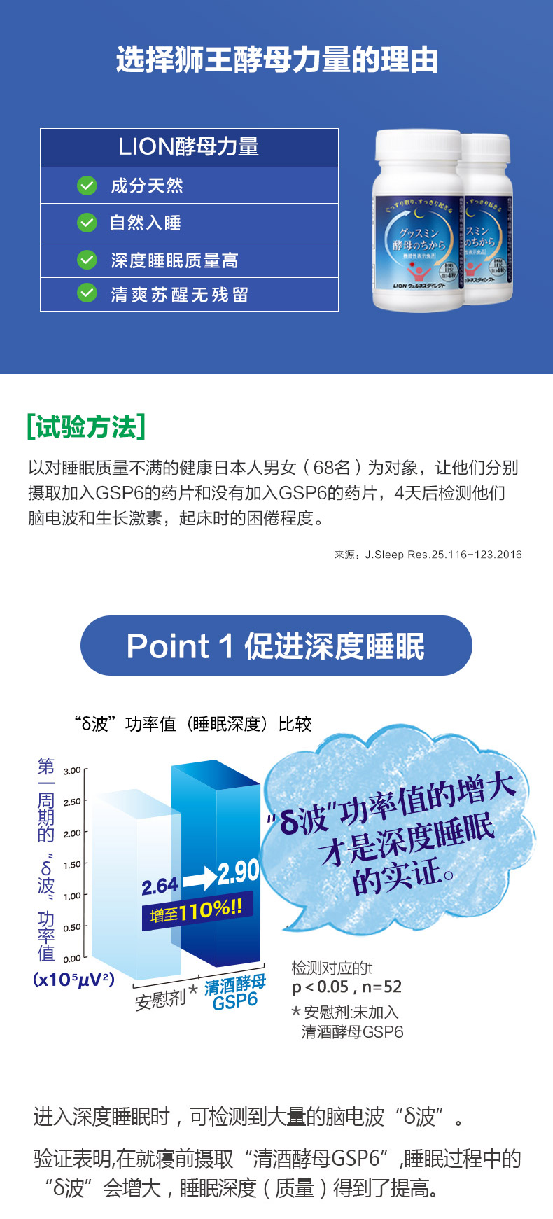 不同于其他促睡眠产品只注重睡眠时间长短,狮王 酵母力量,更看重的是睡眠质量,经过对睡眠不满意的男女进行临床验证表明,服用含有“清酒酵母GSP6”的狮王酵母力量后,睡眠过程中对于脑波的检测,证明睡眠质量确实得到了有效提高;而且起床后“不易感到困意”的实感。第二天清爽起床,精神饱满。