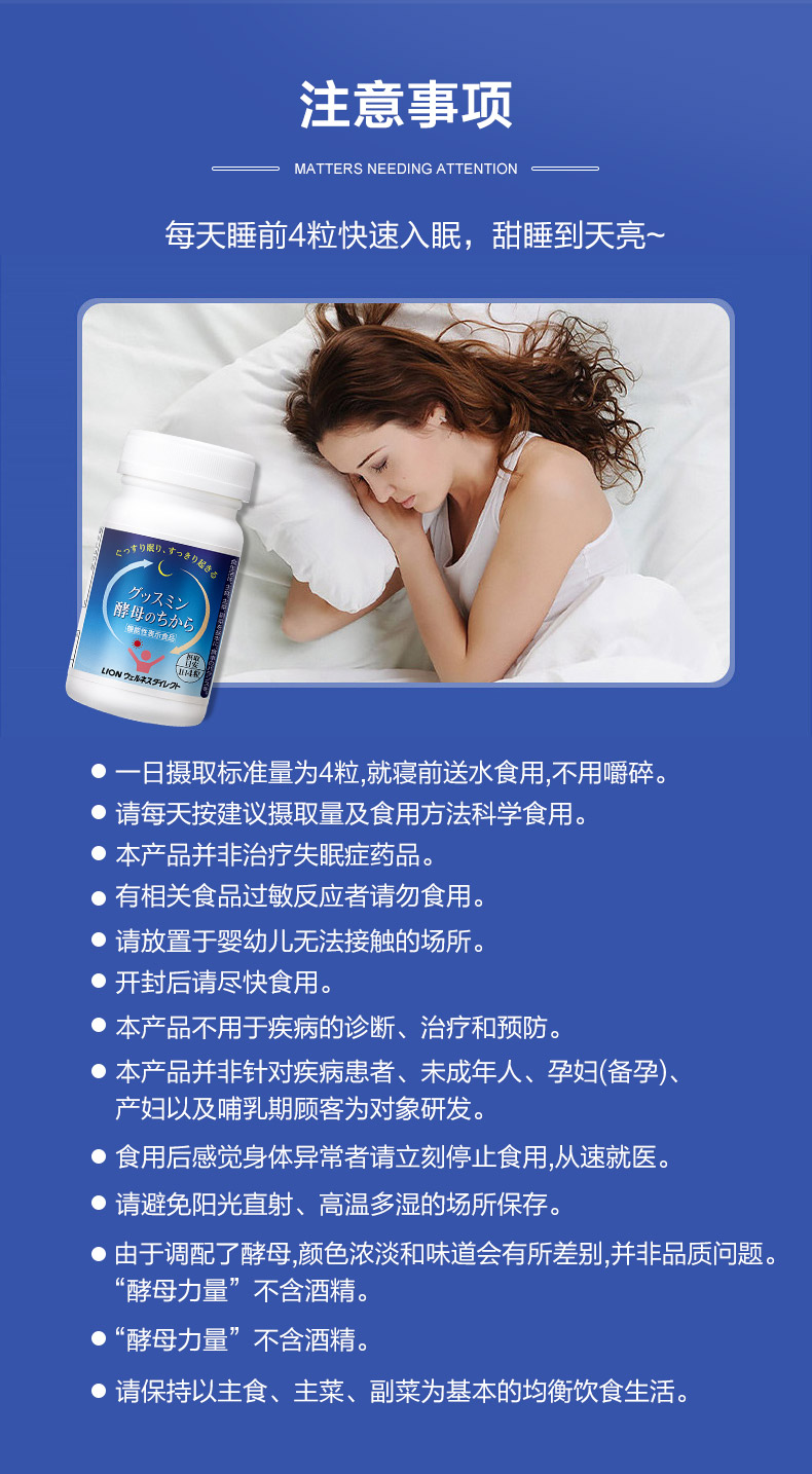 酵母力量是日本狮王研发的助眠产品,狮王经过几十年的研究,在现存的最古老的清酒酵母里遴选出来的清酒酵母GSP6,其具有提高睡眠质量、帮助人体清爽苏醒的作用。同时在深度睡眠时,生长激素也会大量分泌,对成年人维持身体健康至关重要。规格:124粒/瓶。