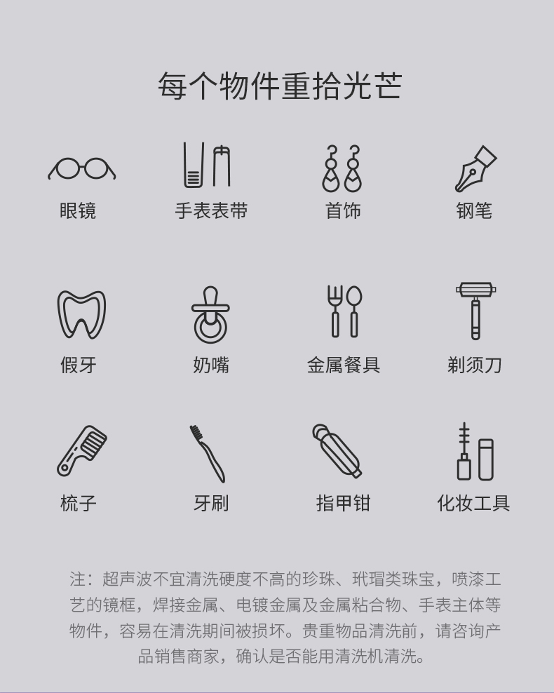 注:超声波不宜清洗硬度不高的珍珠、玳瑁类珠宝,喷漆工艺的镜框,焊接金属、电镀金属及金属粘合物、手表主体等物件,容易在清洗期间被损坏。贵重物品清洗前,请咨询产品销售商家,确认是否能用清洗机清洗。