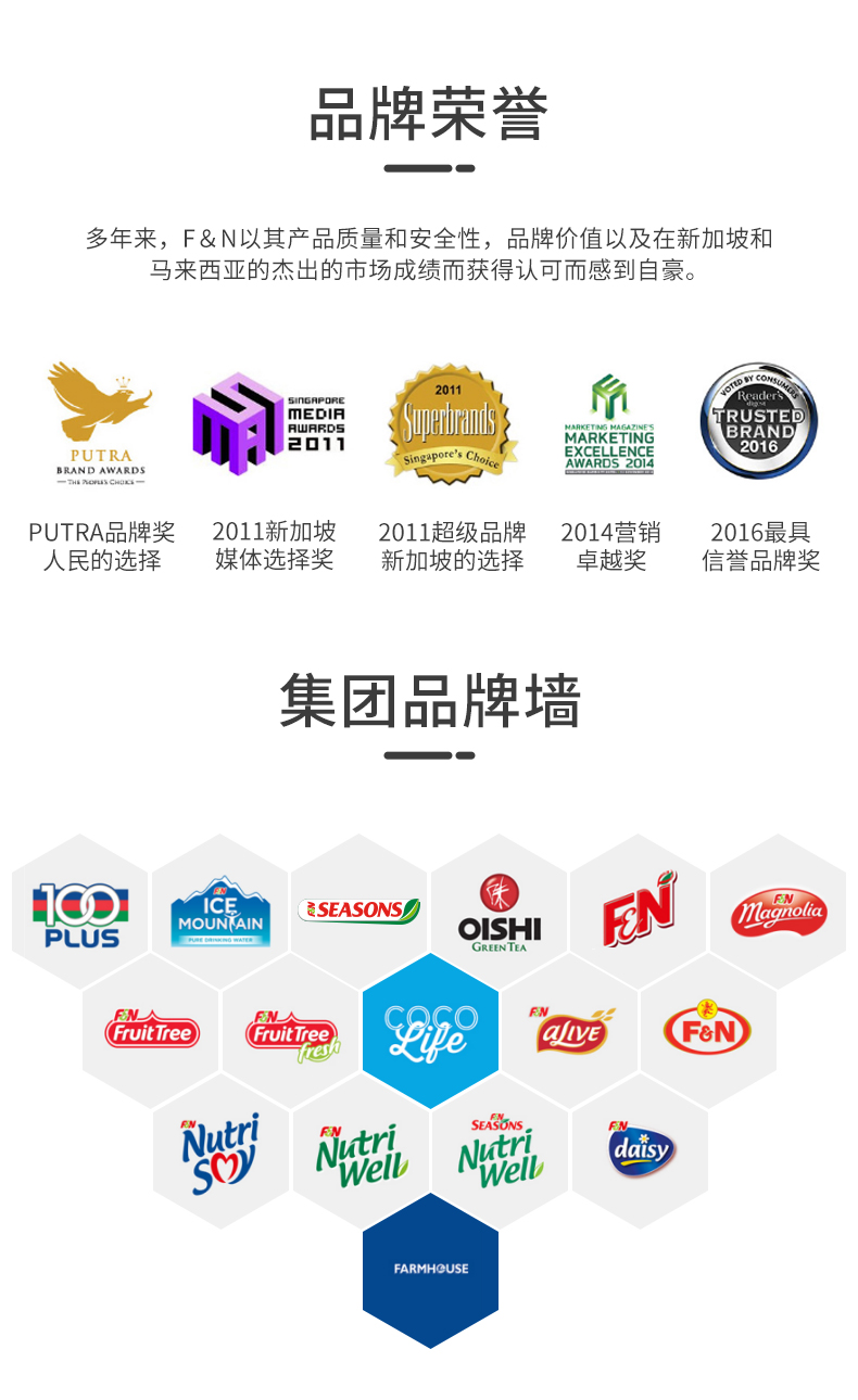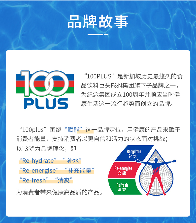 “100PLUS”是新加坡历史最悠久的食品饮料巨头F&N集团旗下子品牌之一,Fraser & Neave Holdings BHD,简称F&N集团,成立于1883年(比可口可乐早3年),是东南亚地区最早的食品饮料企业,旗下食品饮料相关子品牌有20多个,业务横跨整个东南亚地区,并且在大马交易所主办上市,是新加坡最有价值的15个品牌之一。