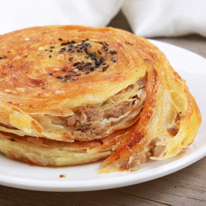 有五香、麻辣两种口味可选。军屯锅盔是成都市非物质文化遗产,源自三国时期,精选面粉、猪肉、菜籽油,秉承古法工艺“一打二抹三翻六转”匠心制作,表皮酥脆,层次分明,内馅肉质饱满,好吃不腻,还原经典四川味道。