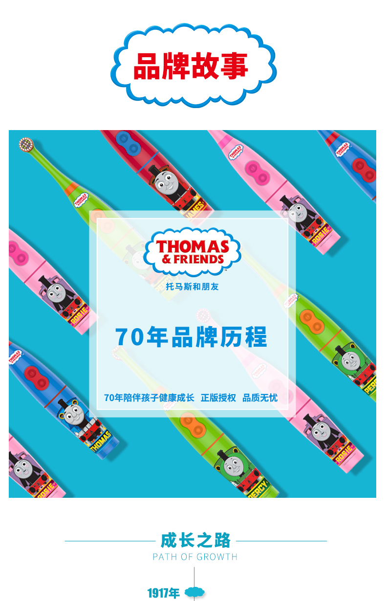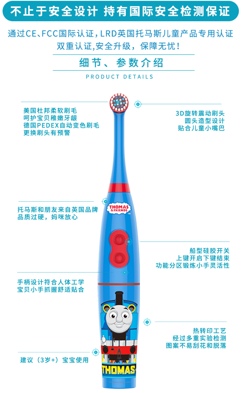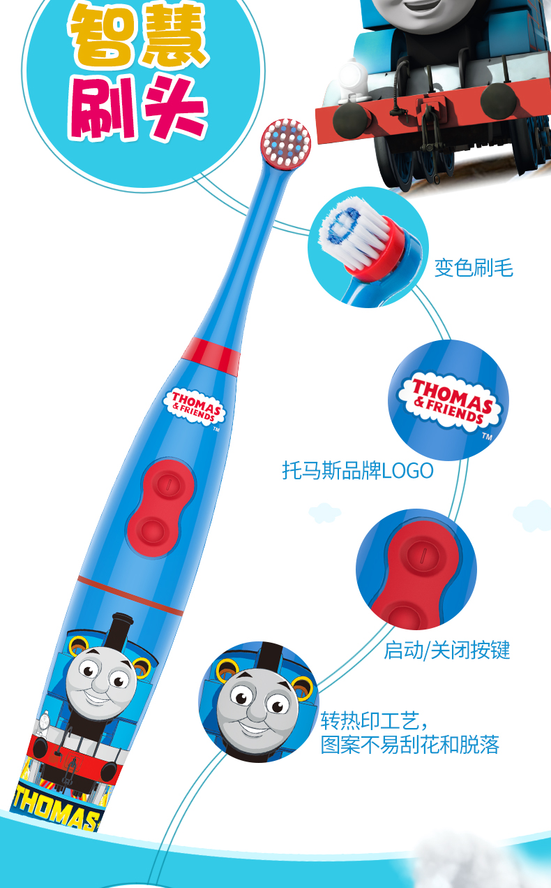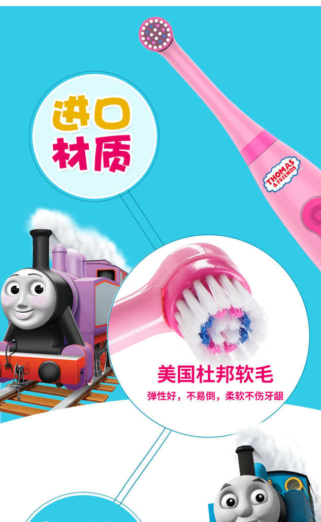 托马斯和朋友儿童智能健康牙刷采用美国进口杜邦细软弹力抑菌刷毛,顶部精密打磨成圆形,0.5mm刷毛高度差,牙缝清扫深入清洁,有效保护孩子稚嫩的牙龈不受伤害,每一根刷毛都经紫外线真空处理,有效抗菌并抑制刷毛病菌滋生。