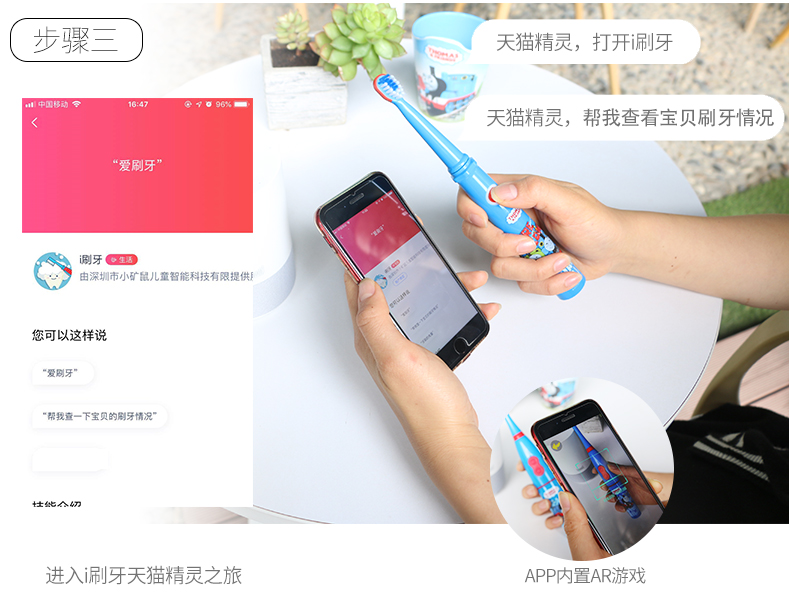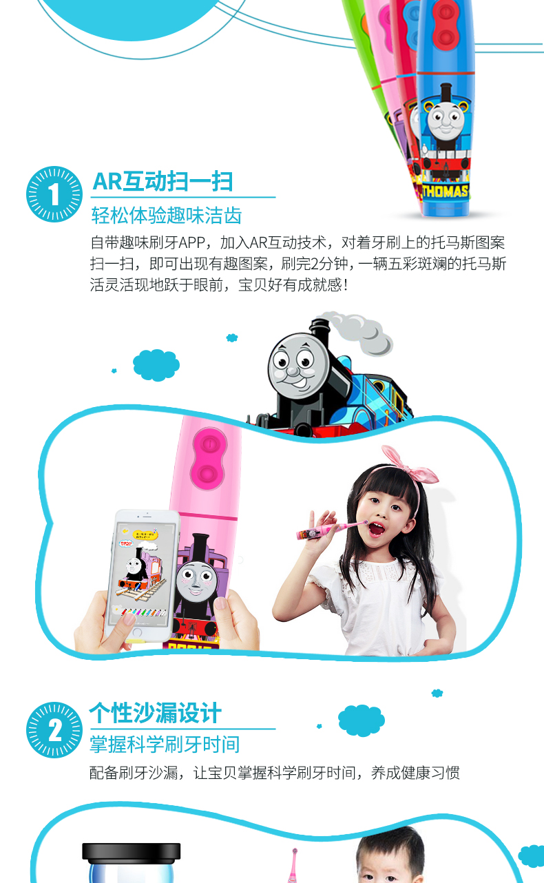 总的来说,托马斯和朋友智能健康牙刷是一款非常适合儿童使用的电动牙刷,托马斯的卡通外观,很大程度上已经吸引的孩子的关注,提升孩子刷牙的主动性。AR技术的智能接入,AR护牙知识的分享,寓教于乐,让原本非常枯燥的刷牙过程变得生动有趣,让孩子完全爱上刷牙,主动科学的刷牙,这就是智能科技带来的改变。
