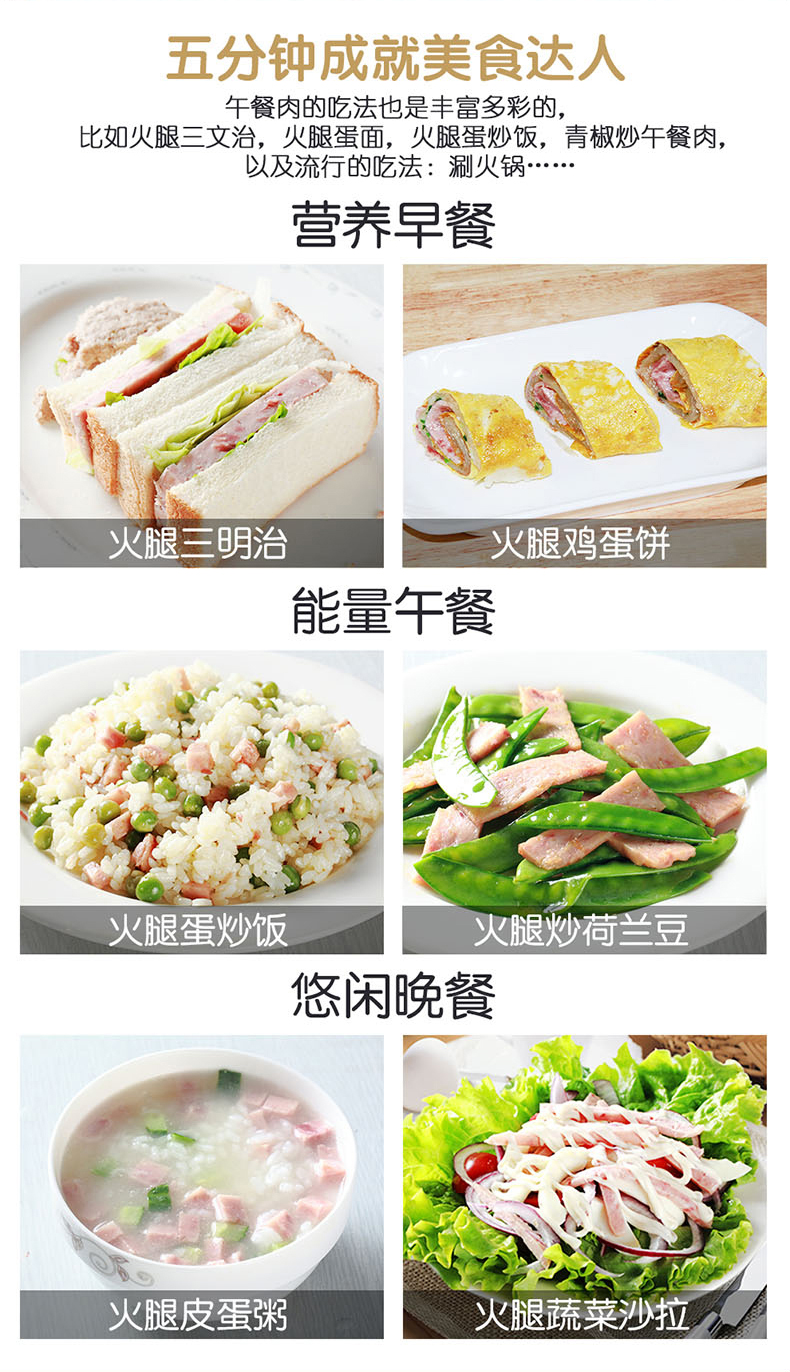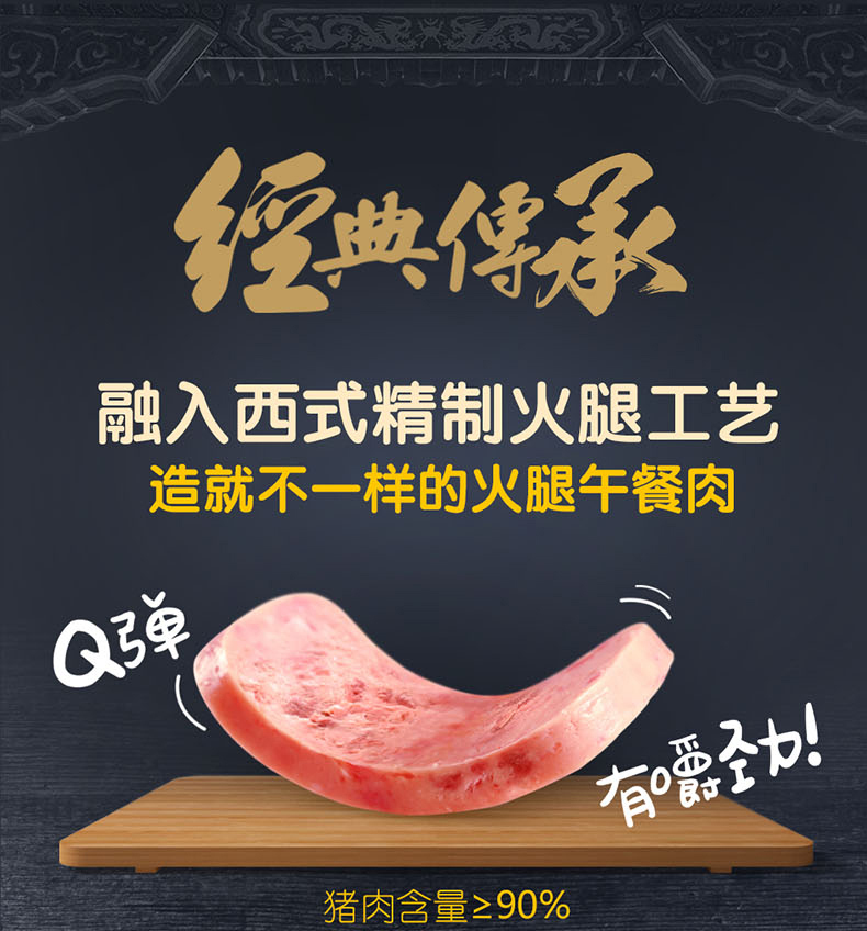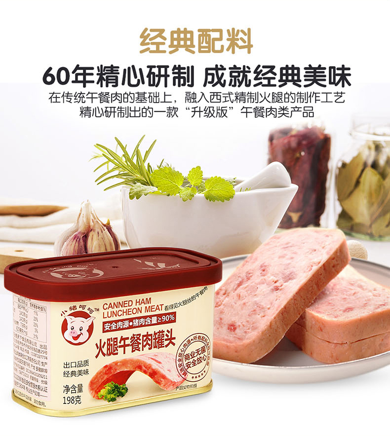 在传统午餐肉的基础上,融入西式精制火腿的制作工艺,优选具有国家检验检疫局认证的猪肉,只使用后腿精瘦肉,先腌后搅,改善口感的同时降低脂肪和热量,采用高温高压,杀菌熟化,食用安全健康。