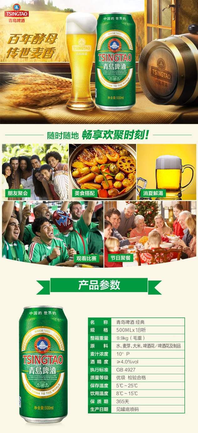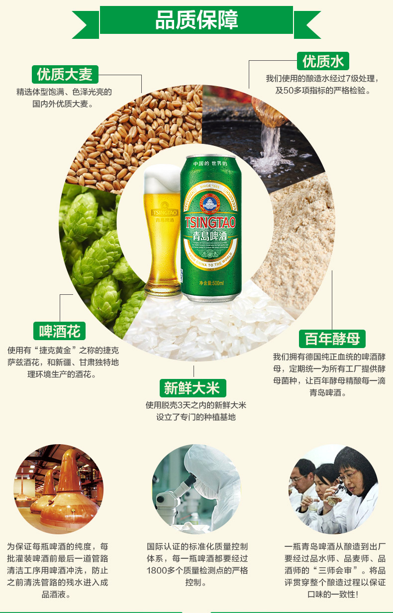 这款青岛啤酒选用优质大米、麦芽、上等啤酒花和软硬适度、洁净甘美的崂山矿泉水为原料酿制而成。原麦汁浓度为10度,酒精含量4.0%。酒液清澈透明、呈淡黄色,泡沫细腻洁白、麦香浓郁,酒体沉厚柔和,香醇爽口。