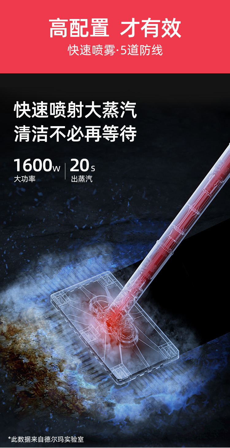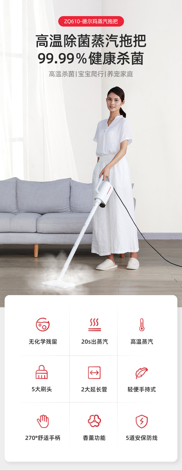 这款德尔玛多功能清洁机,特有2Bar高温蒸汽技术,搭配1600W大功率电机,20秒出蒸汽,喷射强蒸汽深度清洁除菌,纯物理无化学无染,有效杀出螨虫细菌,即拖即干,保证地面干净。此外,还可用来衣物灭菌消毒、厨房油烟清洁,一机多用。