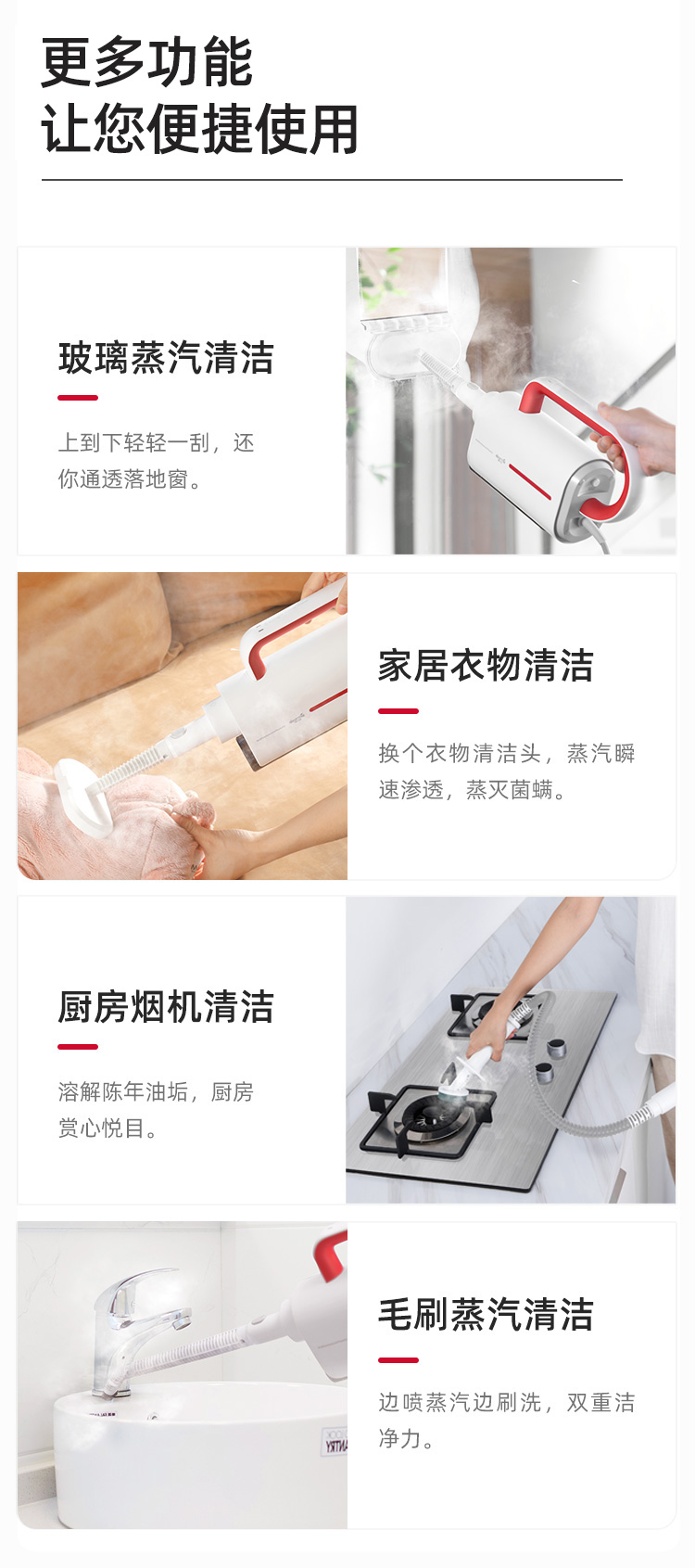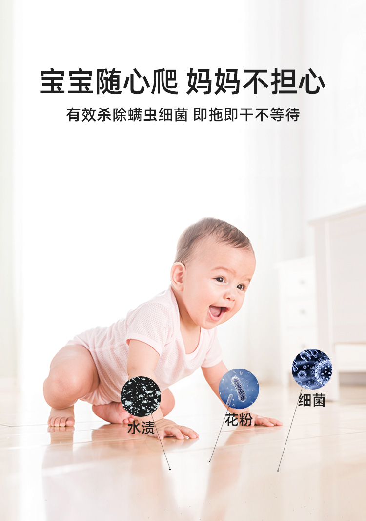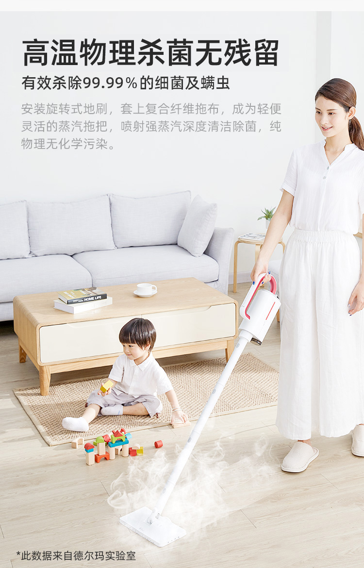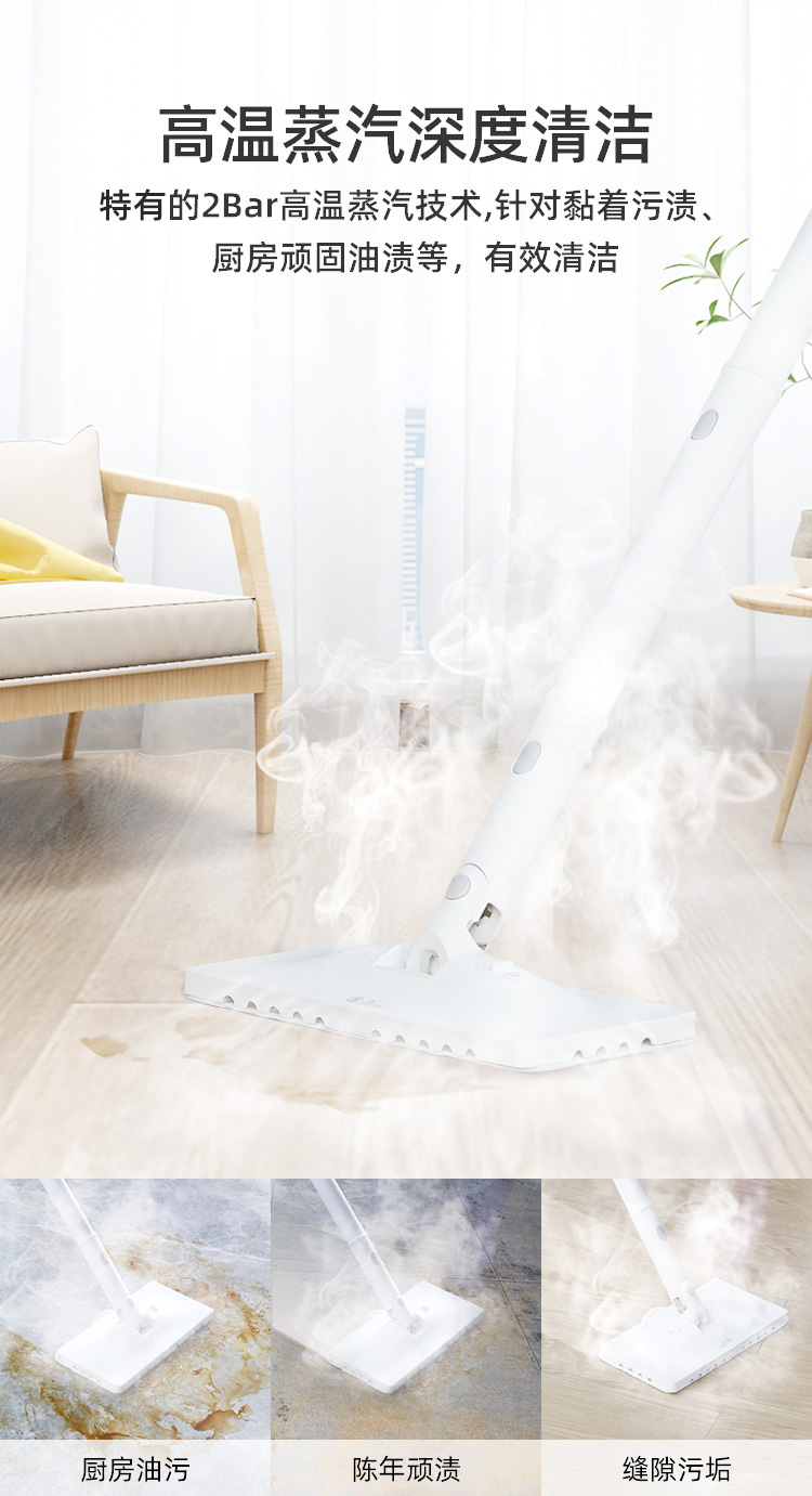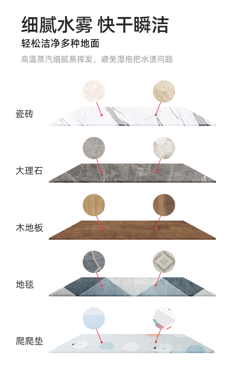 清洁机变蒸汽拖把之后,有效清除地面细菌、宠物异味、螨虫等,可用在瓷砖、大理石、木地板、地毯、爬爬毯等不同材质地面,有小宝宝或家里养宠物的家庭,可保证地板卫生健康。