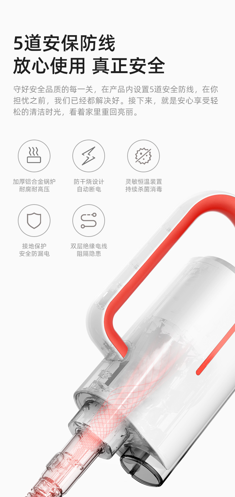 在安全方面,总共有5层保障:机器内部为加厚铝合金锅炉,耐腐蚀高压;防干烧设计自动断电;灵敏恒温装置,持续杀菌消毒;接地保护安全防漏电;双层绝缘电线,使用安全放心。