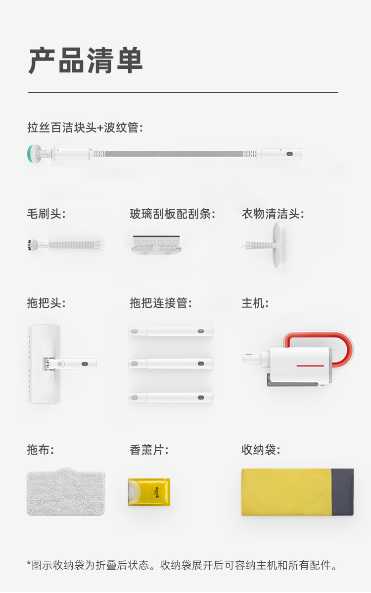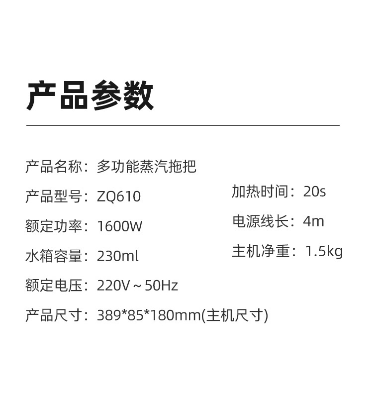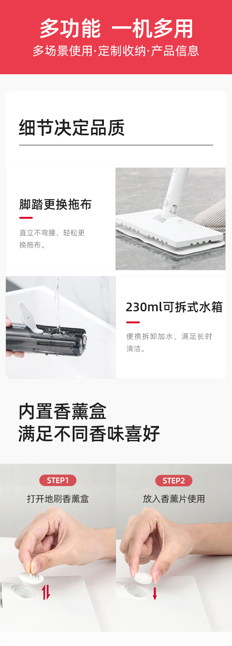 高温蒸汽细腻易挥发、拖完不留水渍,不用二遍清理。机器设计轻巧,长短高度可调节,使用灵活方便,避免下腰,省心省力。配备230ml可拆卸水箱,不用频繁加水,内置香薰盒,可满足不同需要,细节设计贴心。
