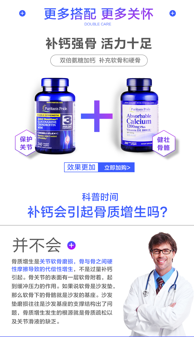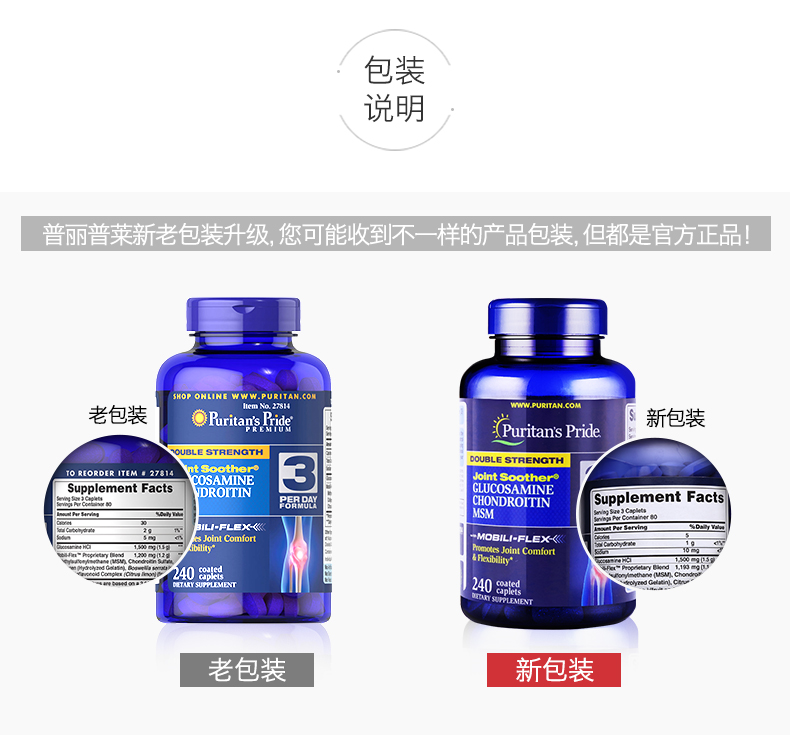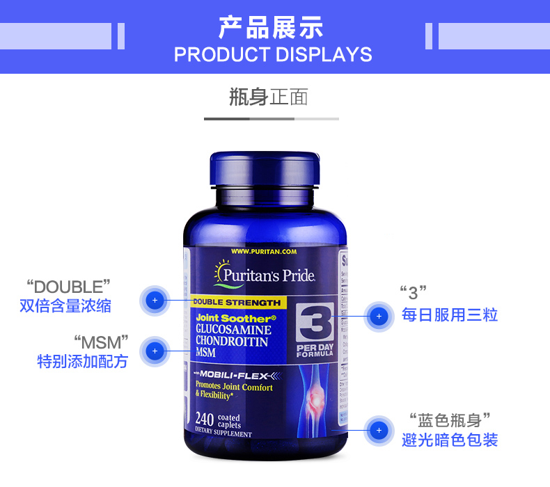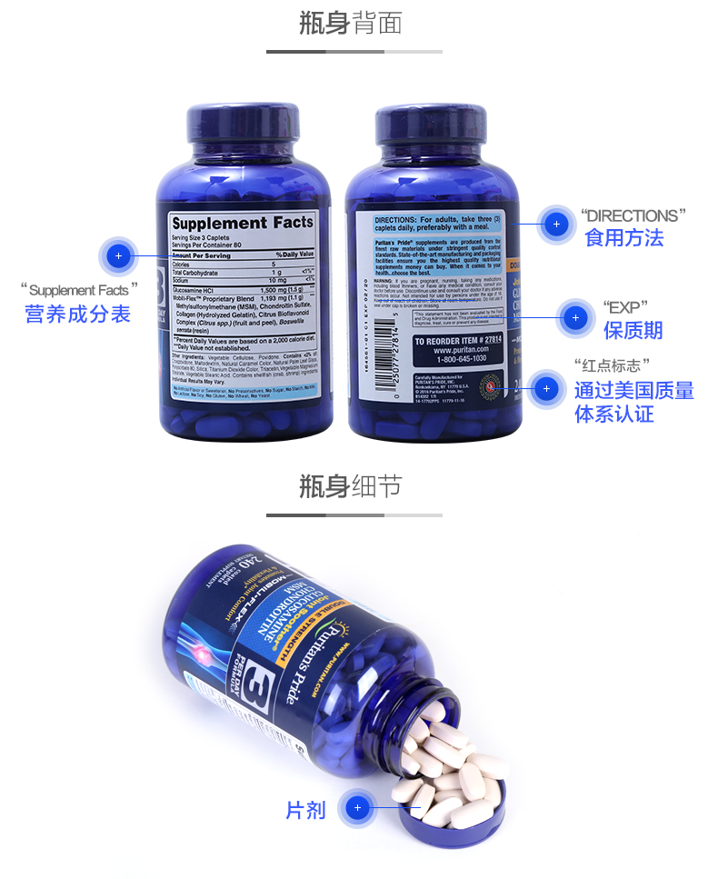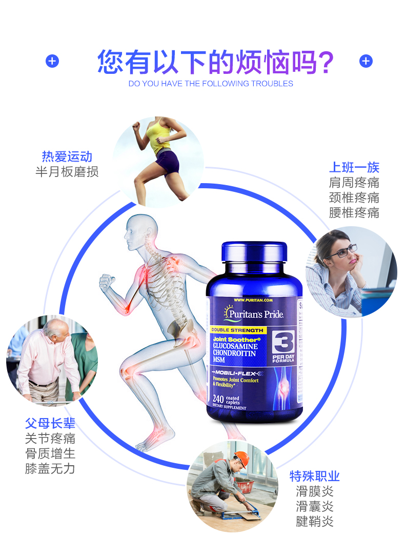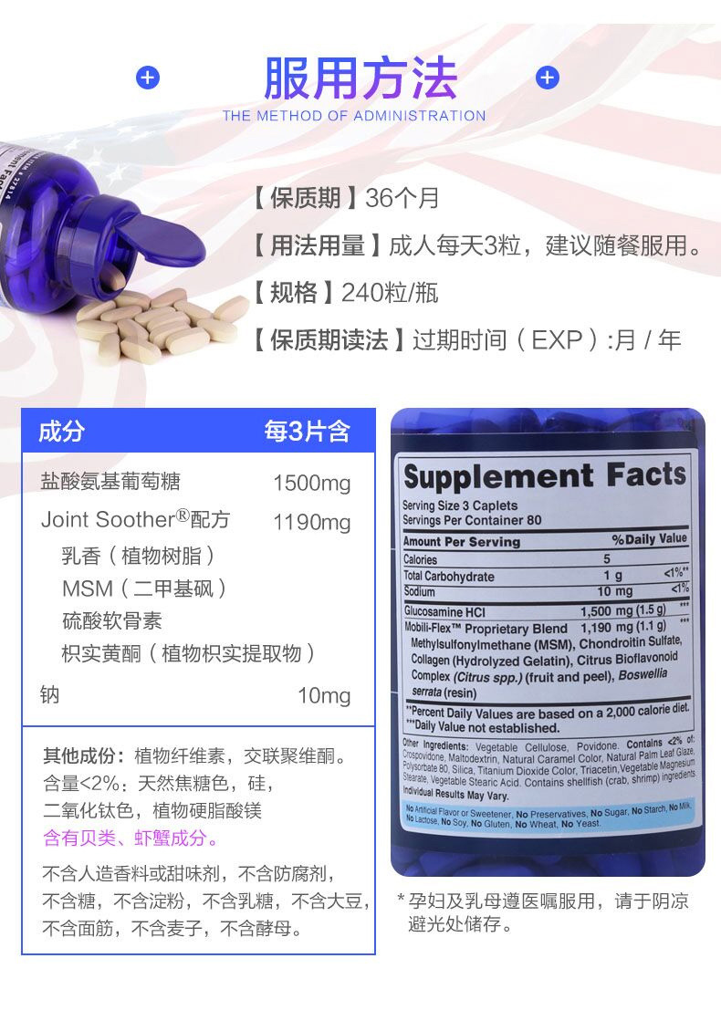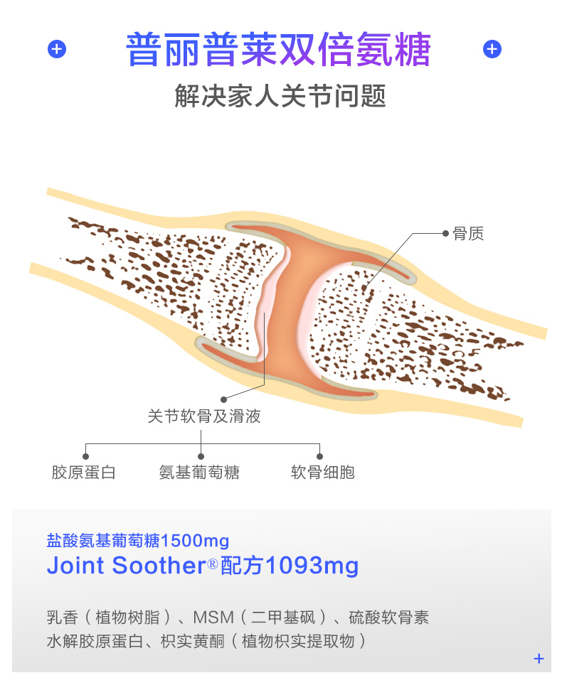 这款 普丽普莱双倍浓度氨糖维骨力 具有促进软骨生长的效用,不仅含有维骨力中常见的氨基葡萄糖和软骨素来帮助修复软骨、维持关节内结缔组织结构的正常,其中多加的MSM基磺酰甲烷更是关键元素,可以缓解多种类型的关节疼痛、保持关节灵活与柔软性。
