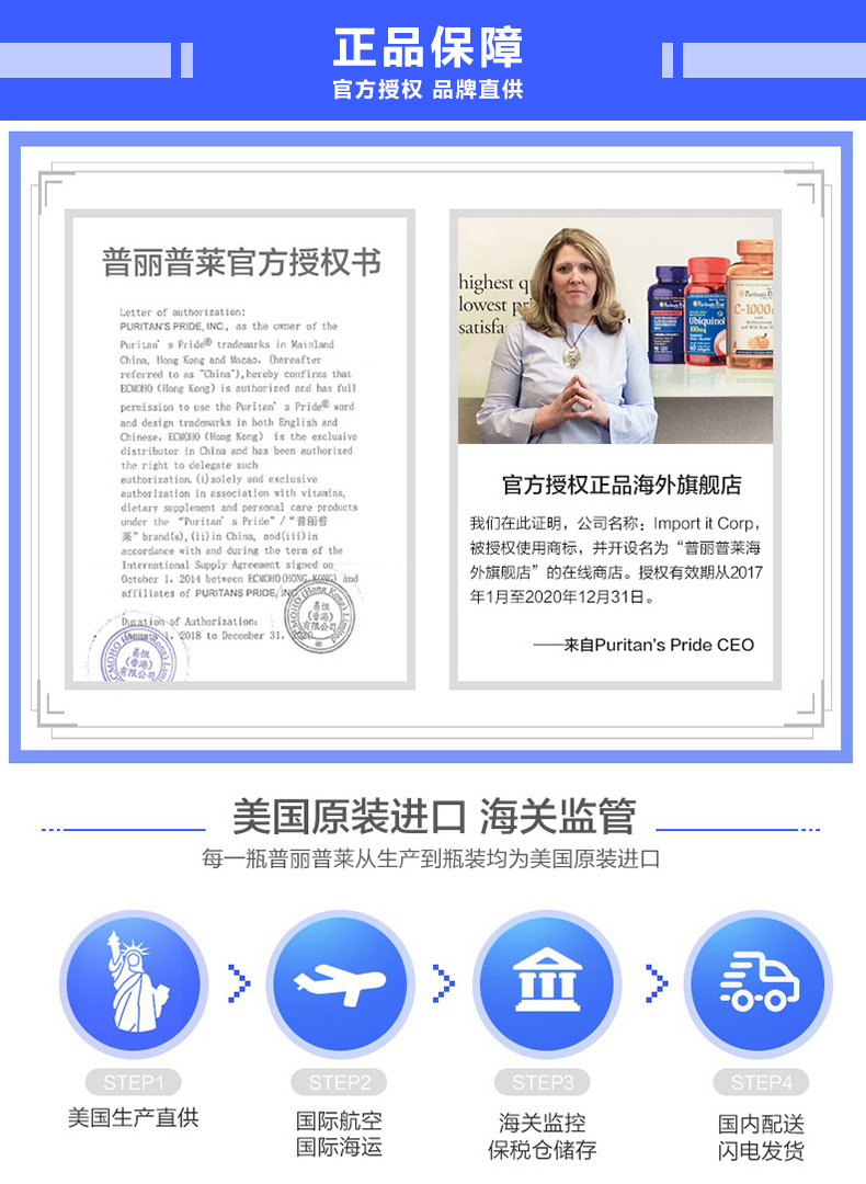 普丽普莱Puritan's Pride是美国规模最大、名气最响的保健品企业,1960年创建于美国纽约长岛,公司生产的所有一千多种保健品全部都通过了美国FDA的认证。目前是NBTY 旗下的公司,NBTY公司前身为自然之宝,于1990年5月正式更名为NBTY。