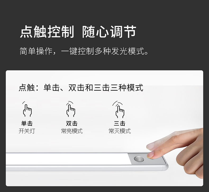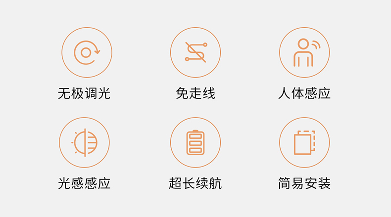 智能双模感应,光感+人感的两种传感器,5米感应距离、120°扇形感应区域,比传统感应灯更聪明地辨识环境光感;自带触控开关,长触无极调光,点触可控制多种发光模式。