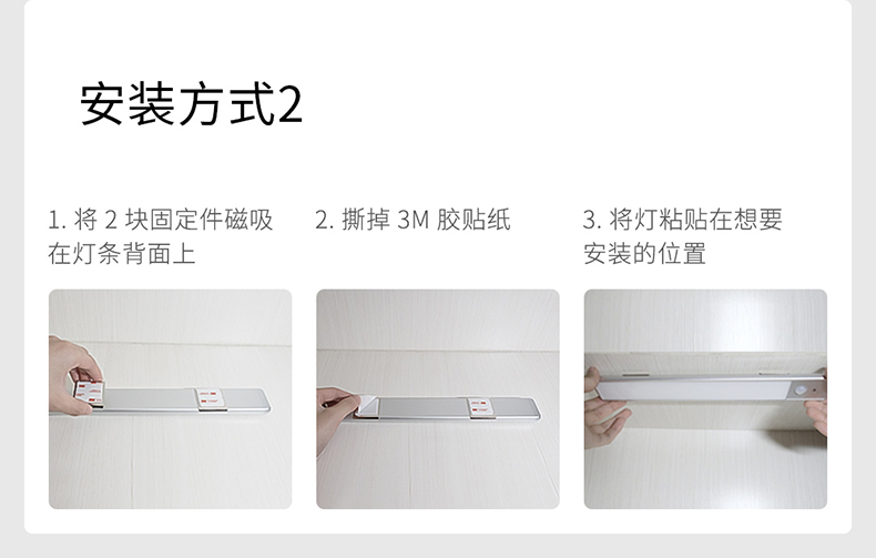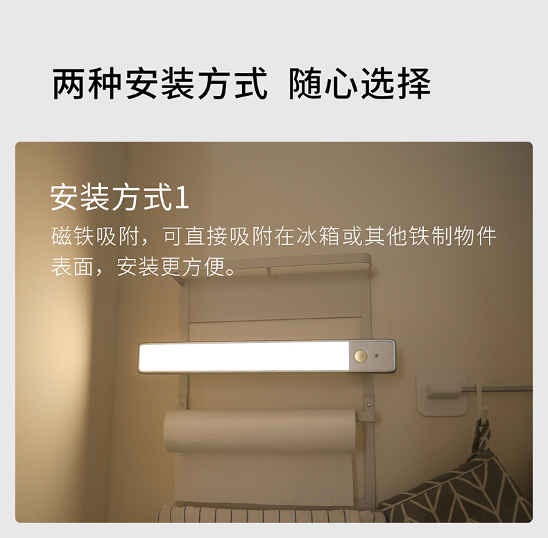 可直接吸附在冰箱或其他铁质物件表面,也吸附在3M背胶的固定件上,安装随意不受限,如:床边、衣柜、洗手间、玄关等区域,也可手持使用,非常方便。
