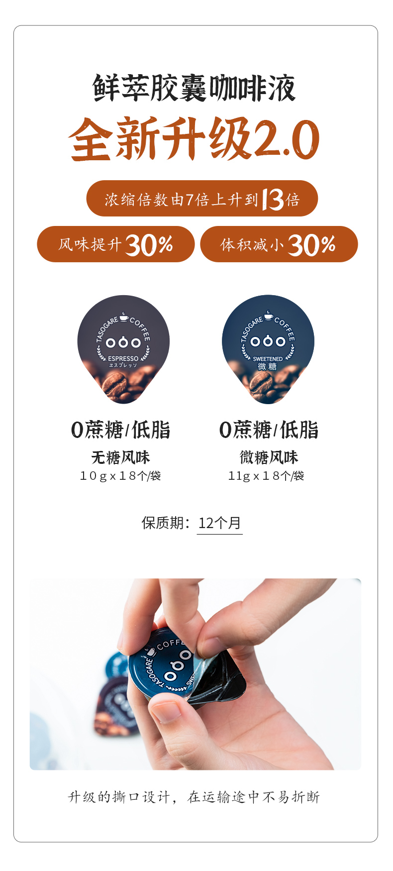 有意式无糖、微糖2种口味可选。日本原装进口,全新升级,由原来的7倍浓缩升级到13倍浓缩,风味提升30%、体积缩小30%,日本鲜萃工艺,8小时低温萃取,氮气充氮保鲜,残氧量低于1%,完美的保留了咖啡的风味和香气。可直接用冷热水/牛奶冲泡,口感媲美现磨咖啡,胶囊便携,随时随地都可享受。