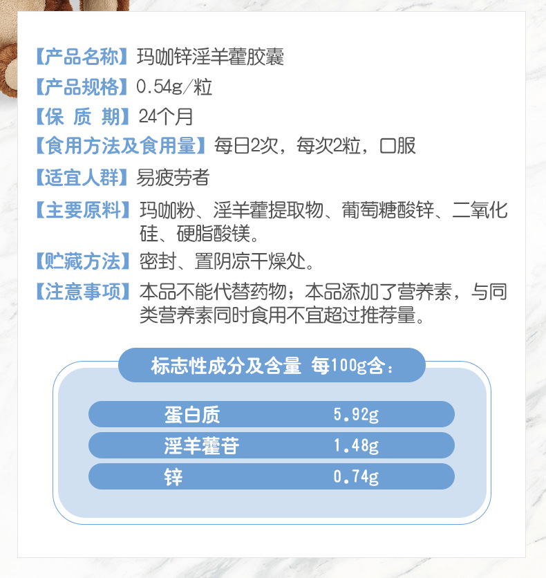 这款爱尔维玛咖锌淫羊藿胶囊是专为男性设计,是以玛咖粉、淫羊藿提取物、葡萄糖酸锌、二氧化硅为主要原料制成的保健品,具有缓解体力疲劳,提高精子活力的效果。规格是140粒/瓶,用法用量:1日2次,1次2片。