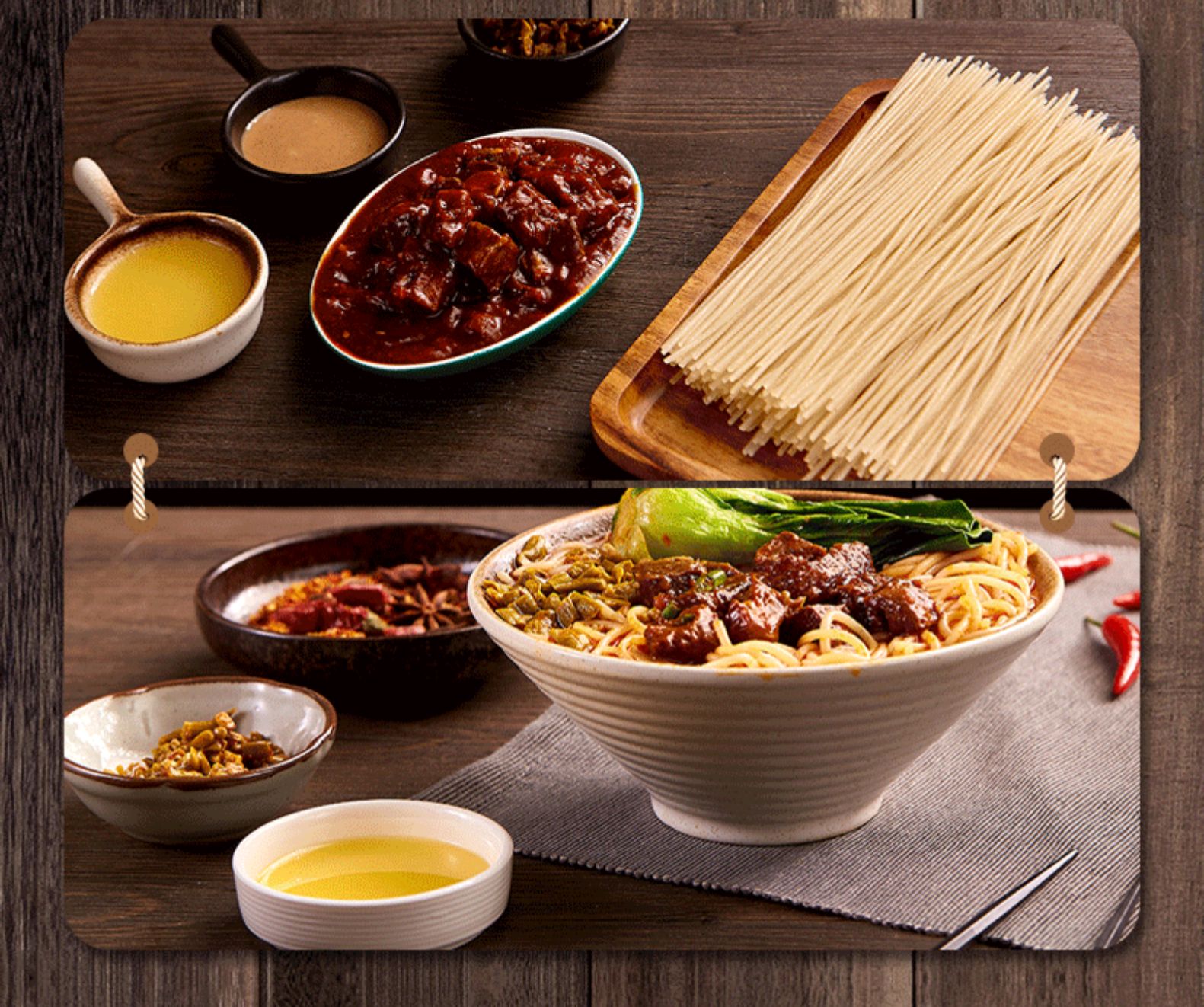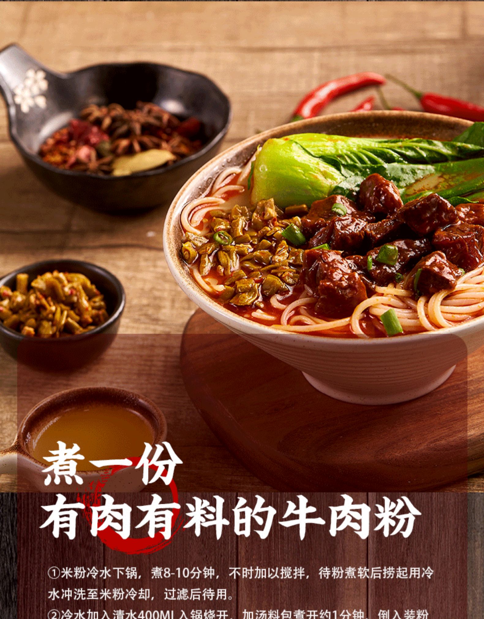 2 冷水加入清水400ML入锅烧开,加汤料包煮开约1分钟,倒入装粉的碗里,即可食用。