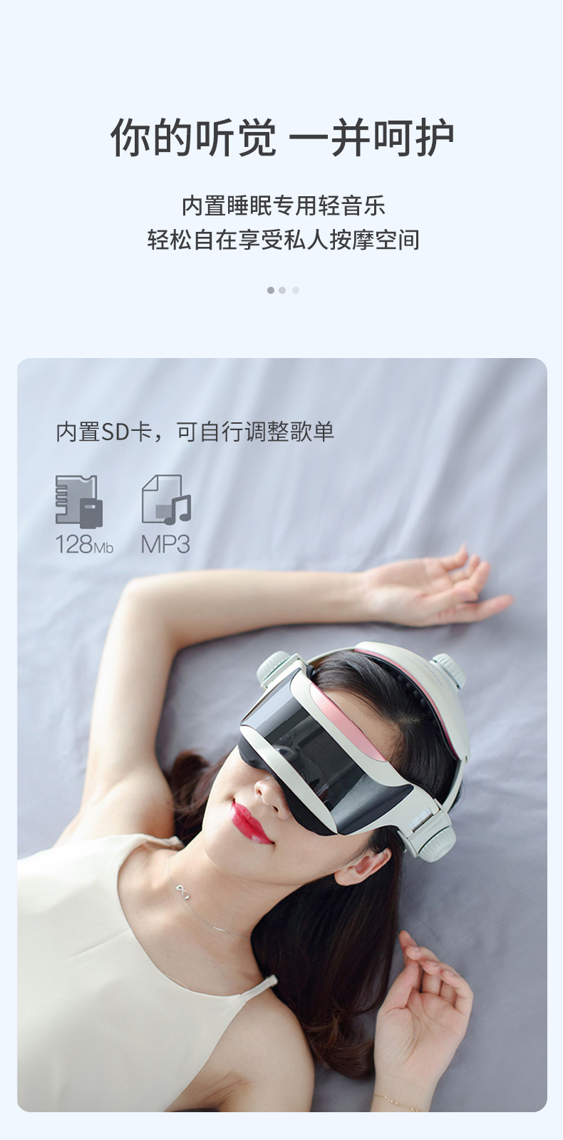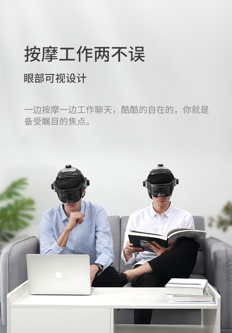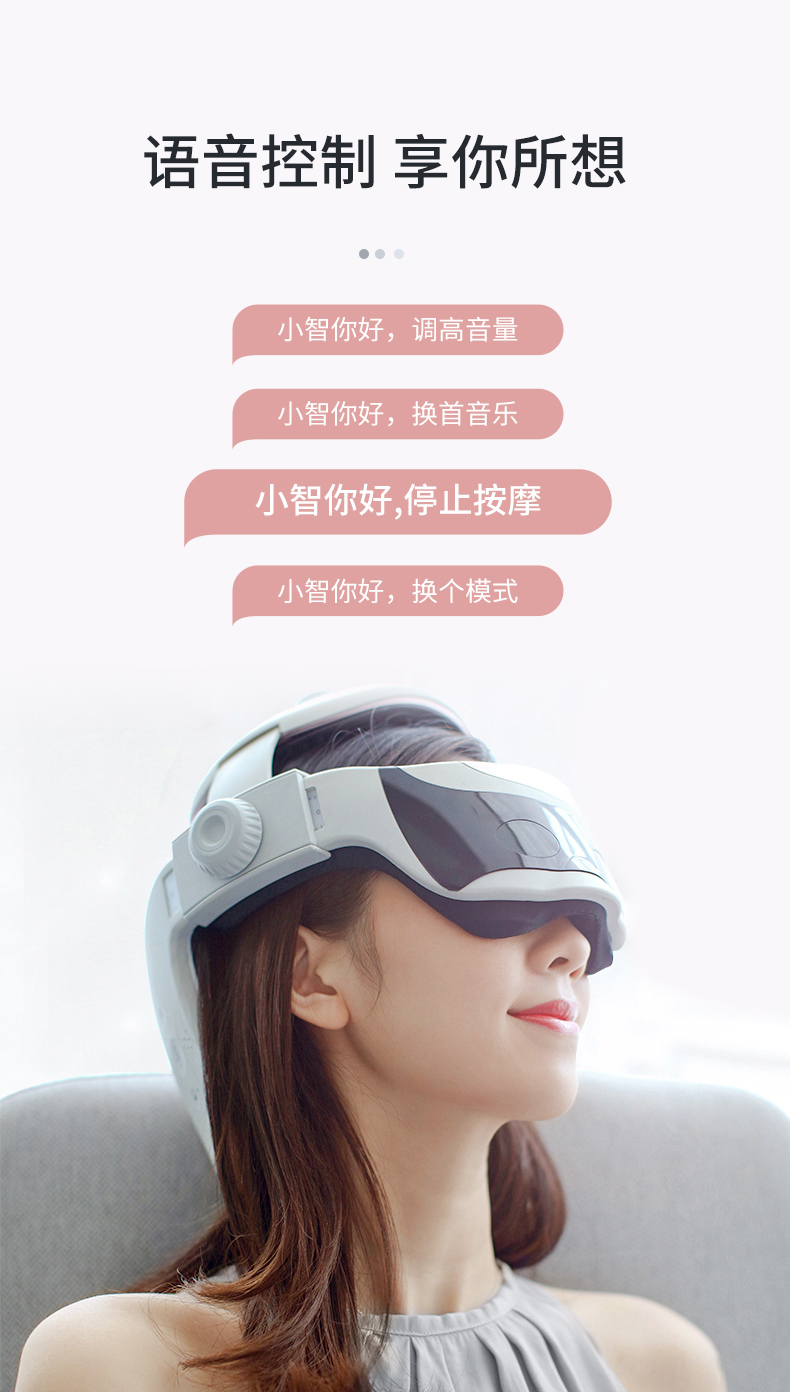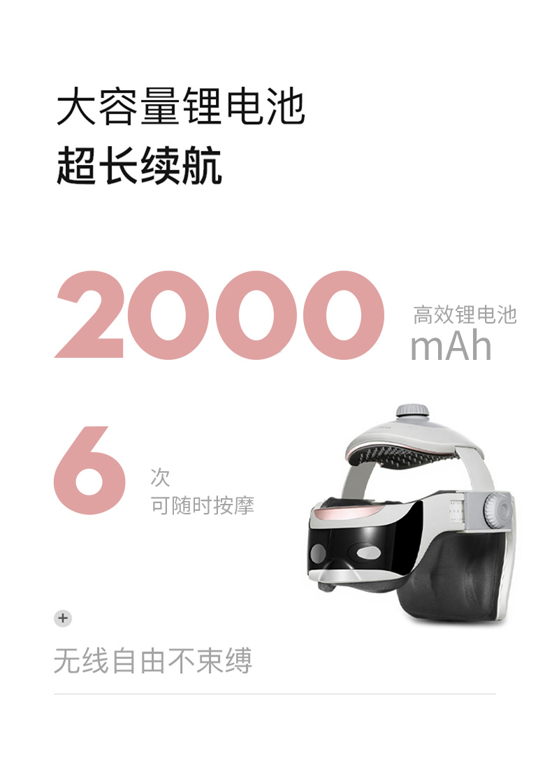 眼部可视设计,按摩同时不影响工作与生活,支持触控+语音控制、音乐播放(内置128Mb SD卡 可下载),舒缓疲劳,减轻压力,头围21档可调,包容各种头型,佩戴舒适,内置2000毫安锂电池,一次按摩15分钟,满电约可用6-7次。