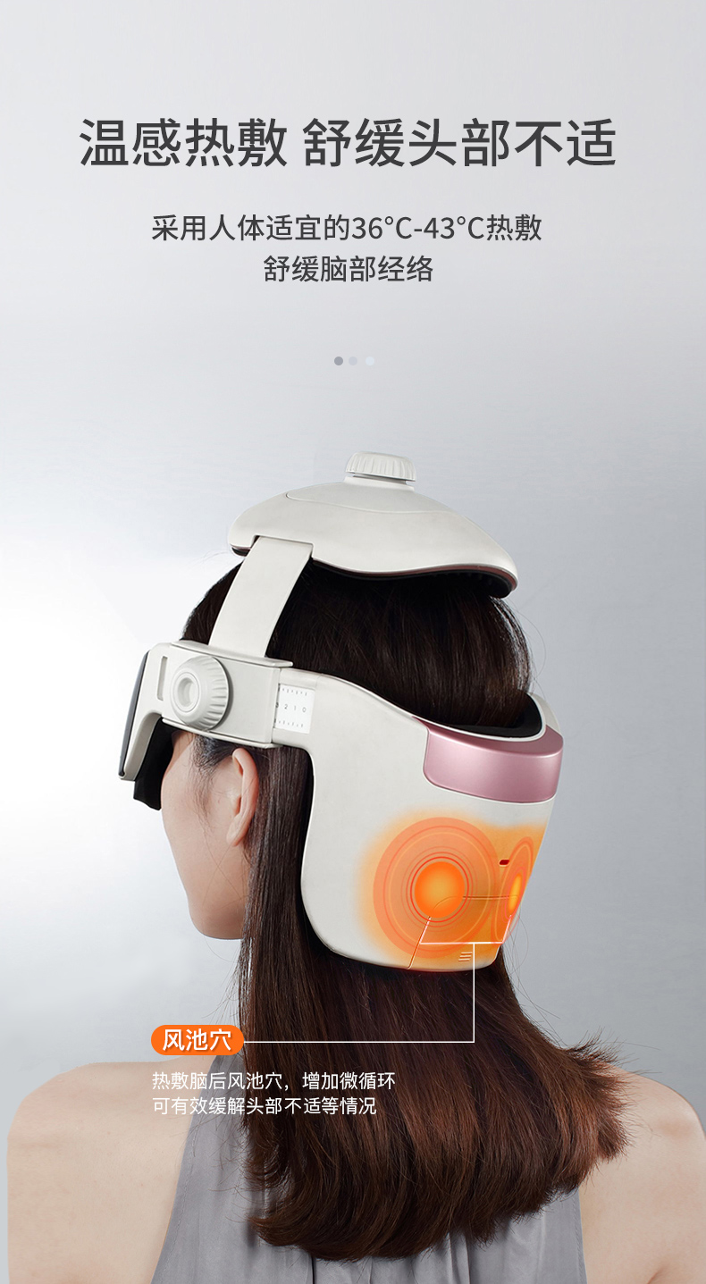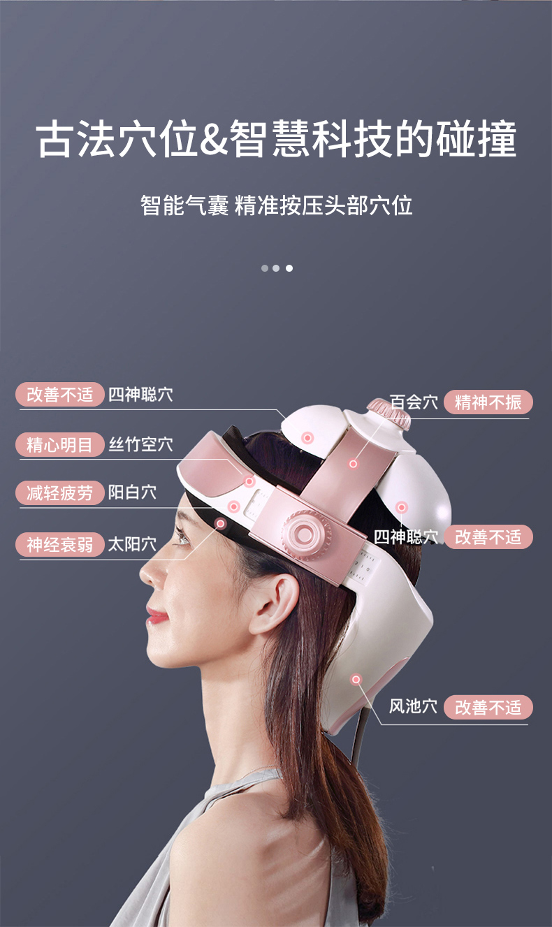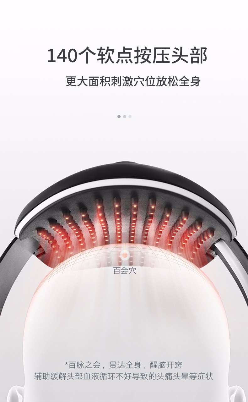 结构上对头顶百会穴、后脑风池穴、还有太阳穴、四神聪穴、阳白穴、丝空竹穴等穴位仿中医按摩手法,精准按摩穴位;头顶百会穴140个软点按压头部,大面积刺激穴位,辅助缓解头部血液循环不好导致的头痛头晕等症状;