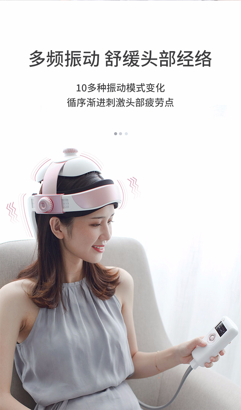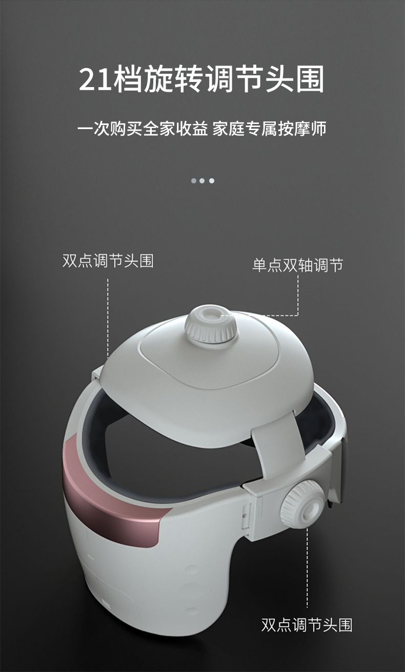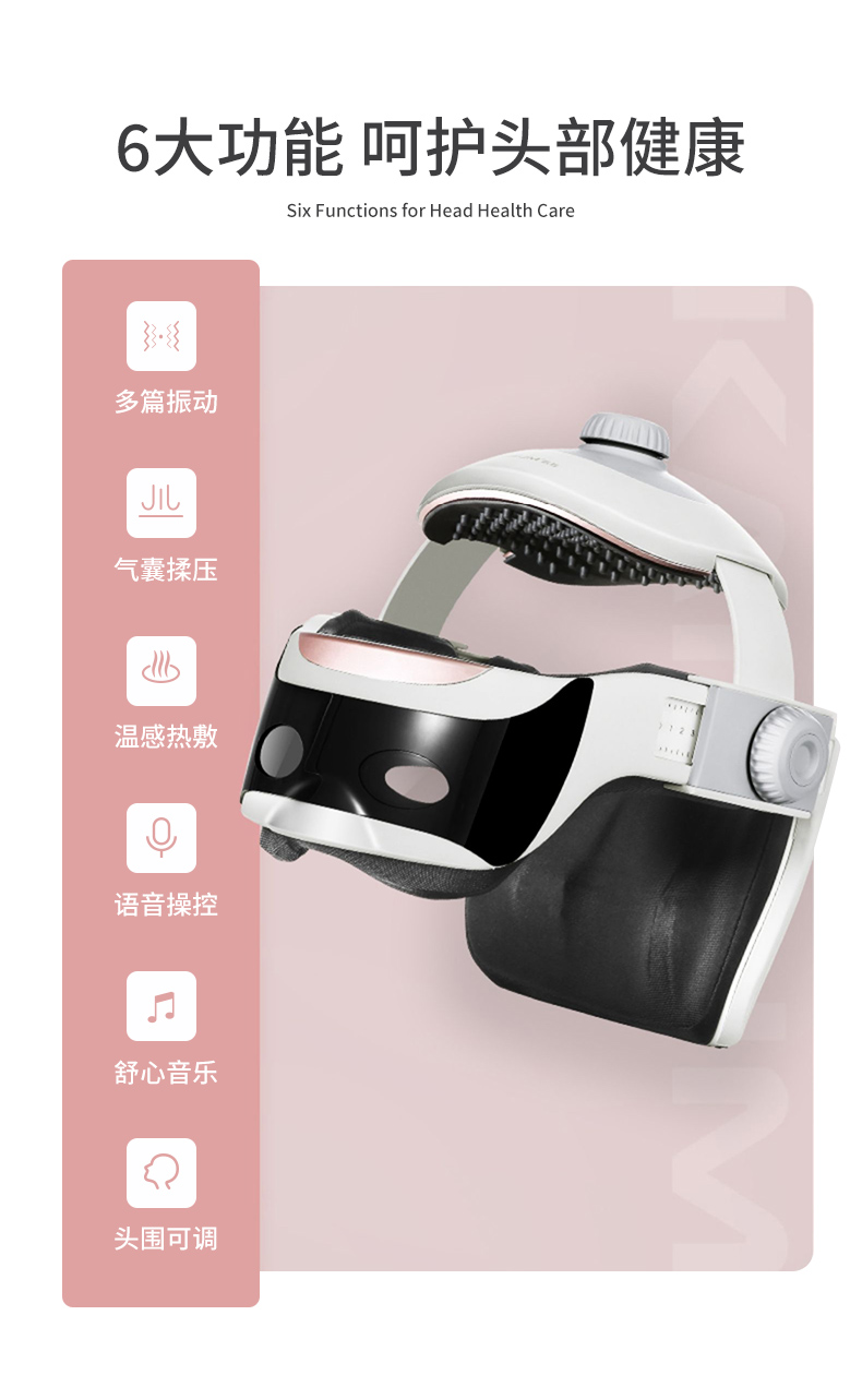 结构上对头顶百会穴、后脑风池穴、还有太阳穴、四神聪穴、阳白穴、丝空竹穴等穴位仿中医按摩手法,精准按摩穴位;头顶百会穴140个软点按压头部,大面积刺激穴位,辅助缓解头部血液循环不好导致的头痛头晕等症状;