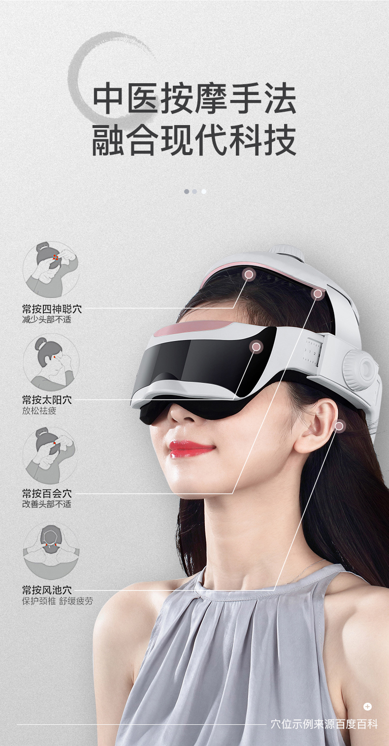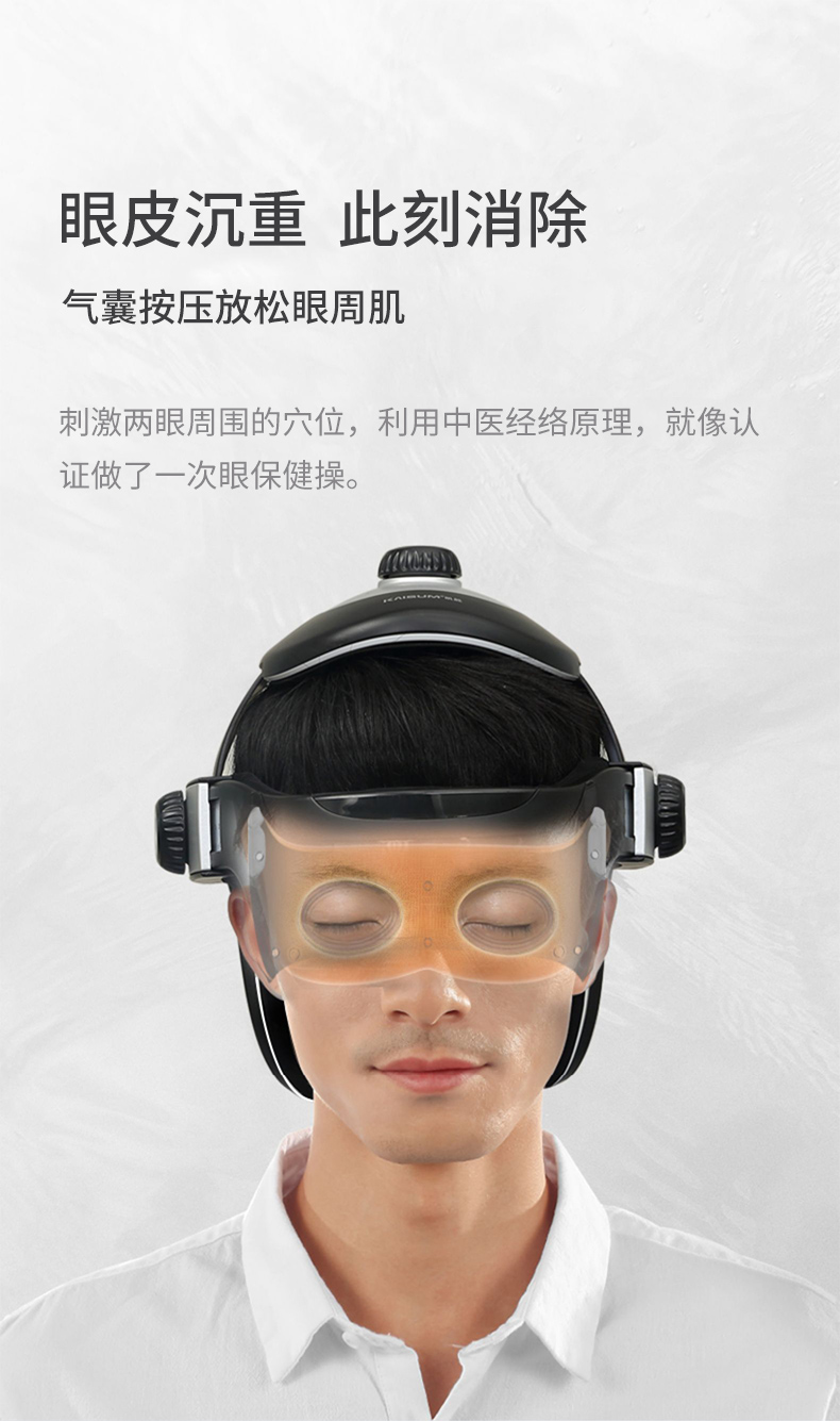 有10种多频震动模式,循序渐进刺激疲劳点,松弛头眼紧绷经络和肌肉,利用中医经络远离,通过气囊对两眼周围穴位揉捏、按压,放松眼肌促进血液循环,36~43℃温度热敷,舒缓疼痛、疲劳,解压助眠,放松身体。