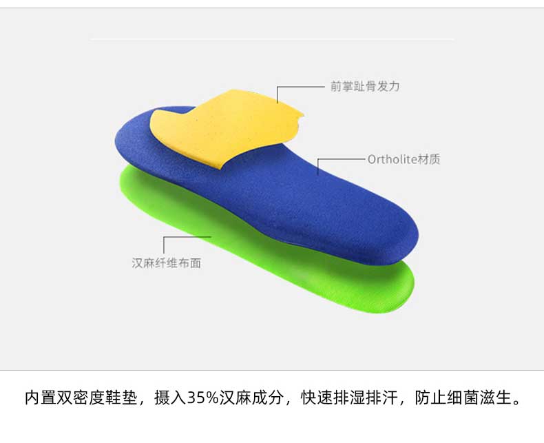 专为跑步者设计的双密度鞋垫,三层结构设计:前置前脚趾骨发力+中层Orthilite+底层汉麻纤维布,具有很强的吸汗、防霉、防臭等功能,使跑者脚时刻保持干爽舒适。