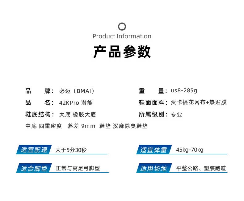 这双必迈Mile 42K Pro潜能 是定位全马拉松距离的42公里的专业跑步鞋,适合大多数人业余跑步爱好者,或者当做日常的跑步健身鞋。适合体重在45-70kg重的人穿,无论是公路和塑胶跑道都没问题。