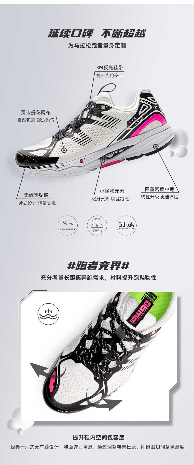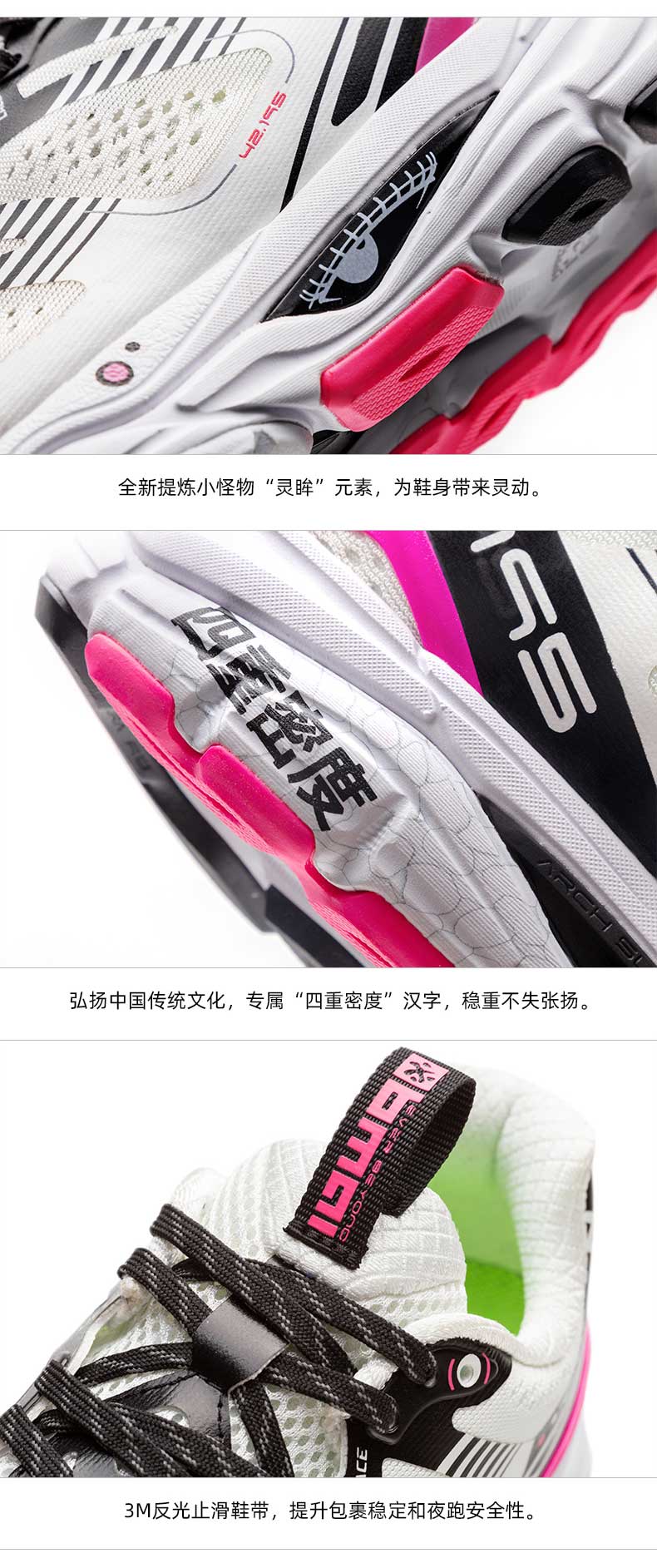 同时鞋面上还覆盖有专属全马反光银标识,既能增加夜跑的安全性,还能很好的稳固鞋面不变形,也能彰显跑马拉松的么魅力与精神(特点就是帅)。