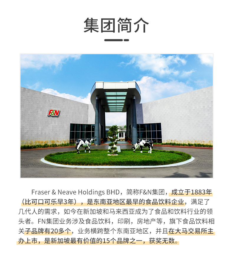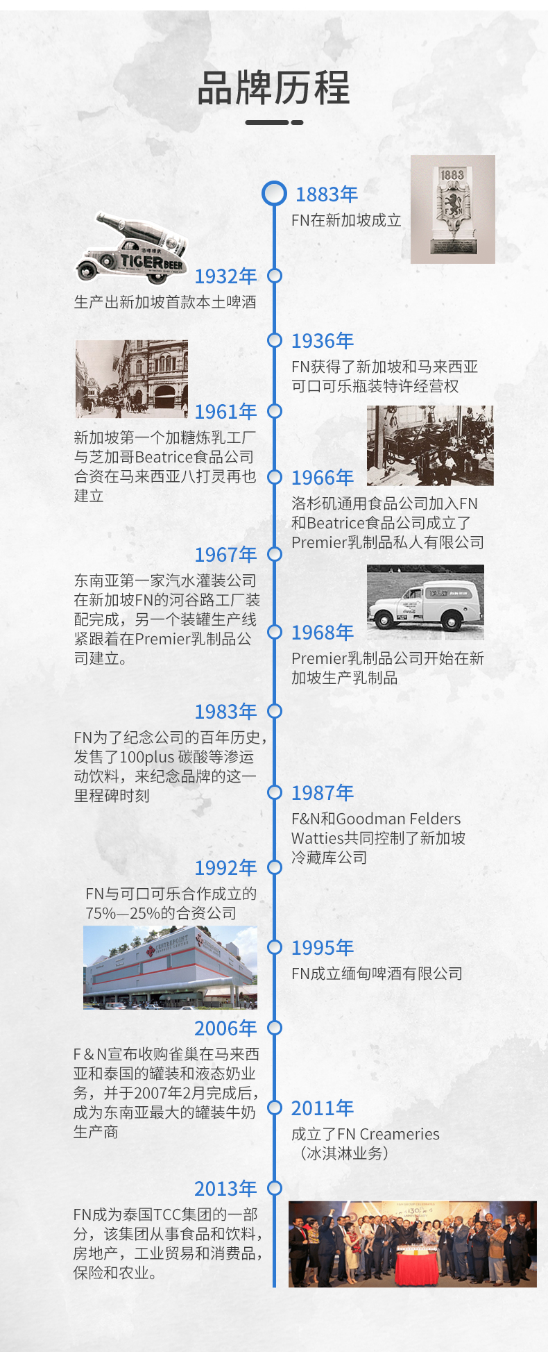 “100PLUS”是新加坡历史最悠久的食品饮料巨头F&N集团旗下子品牌之一,Fraser & Neave Holdings BHD,简称F&N集团,成立于1883年(比可口可乐早3年),是东南亚地区最早的食品饮料企业,旗下食品饮料相关子品牌有20多个,业务横跨整个东南亚地区,并且在大马交易所主办上市,是新加坡最有价值的15个品牌之一。