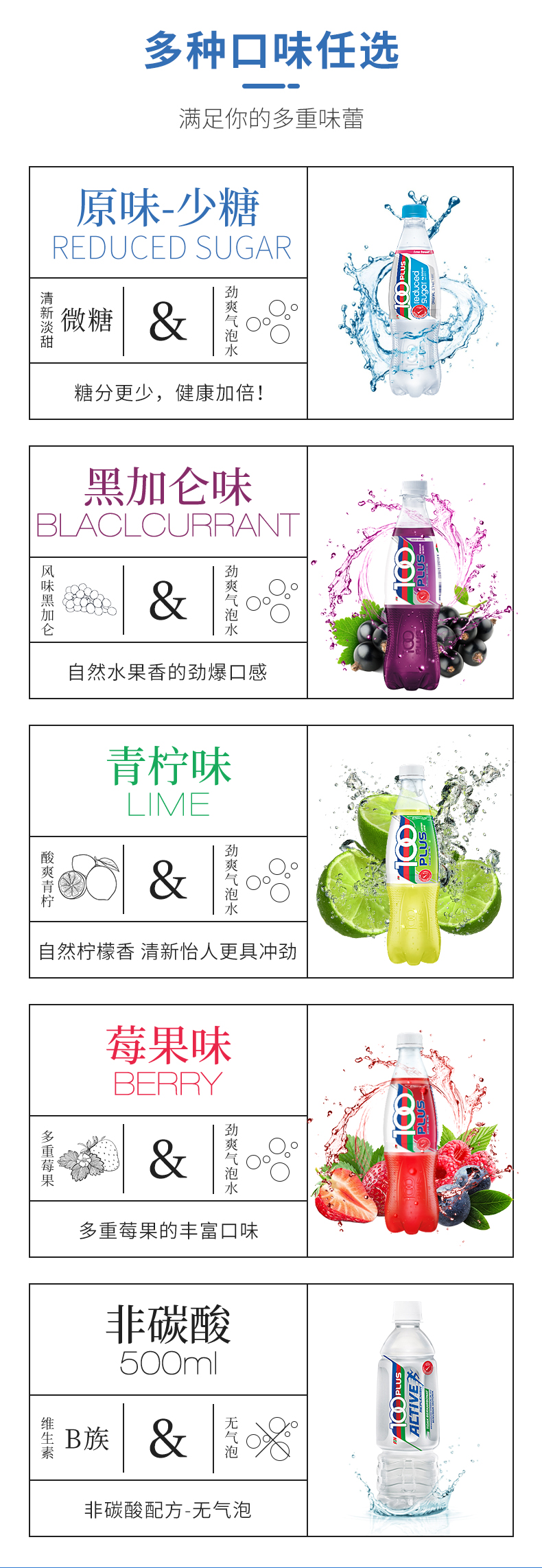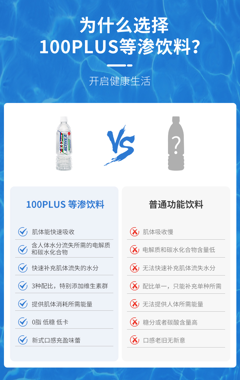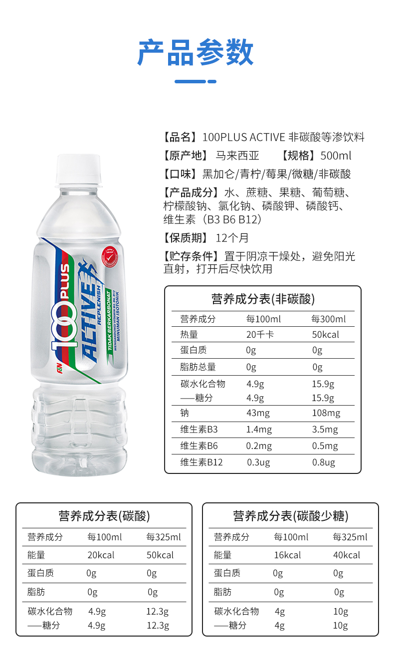这款100 Plus 等渗功能饮料,马来西亚原装进口,独特的配方结合水分、碳水化合物以及电解质,帮助身体更快速有效地吸收水分,碳水化合物以及电解质,还特别添加了维生素群,为肌体提供消耗的能量,0脂、低糖、低卡、口感上有点像苏打水,清爽原味,无论是运动后喝或者当做休闲饮料都没问题。