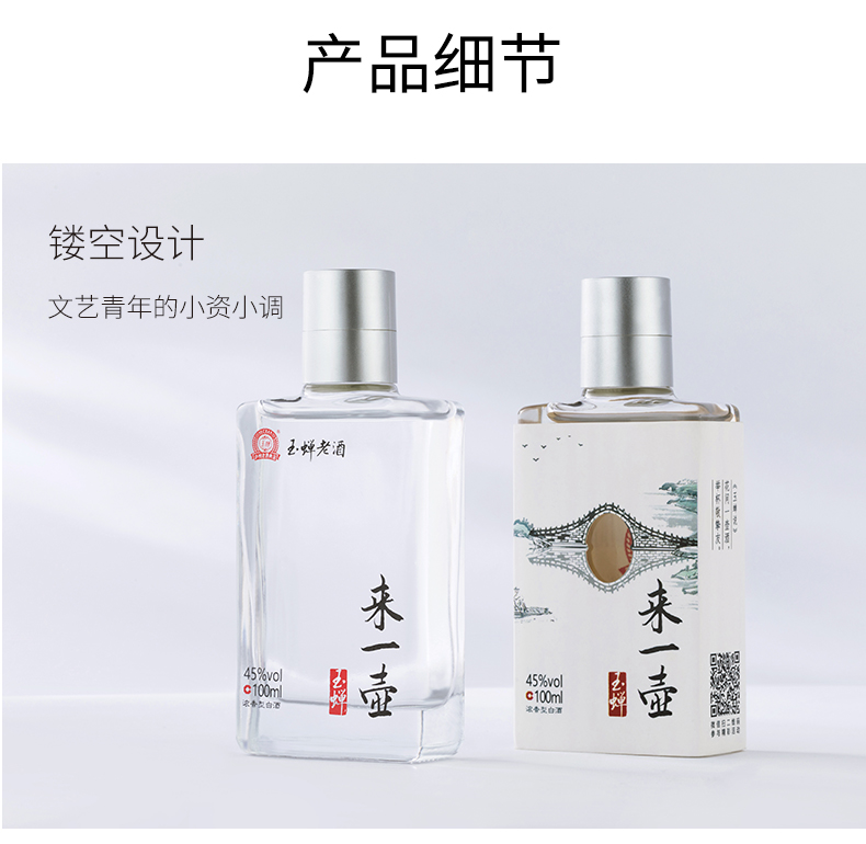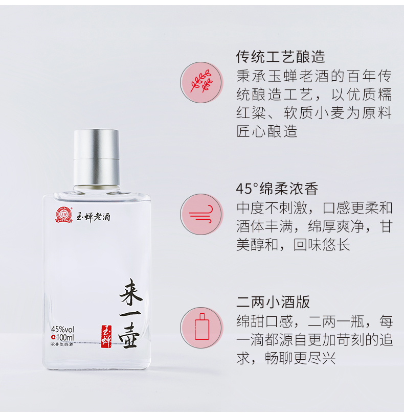 此款玉蝉来一壶,采用优质红高粱、小麦为原料,纯粮酿造,采用10年以上基酒勾兑,45°绵柔浓香,中度不刺激,口感更柔和,酒体丰满,口感绵甜,回味悠长,二两小酒版,畅饮更尽兴。