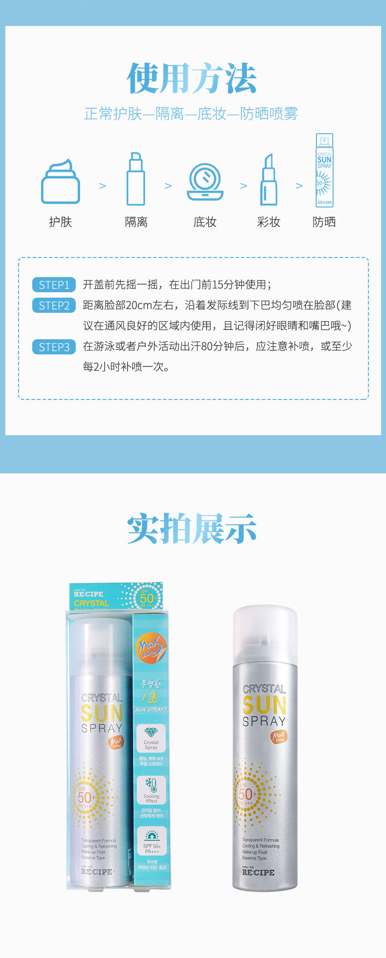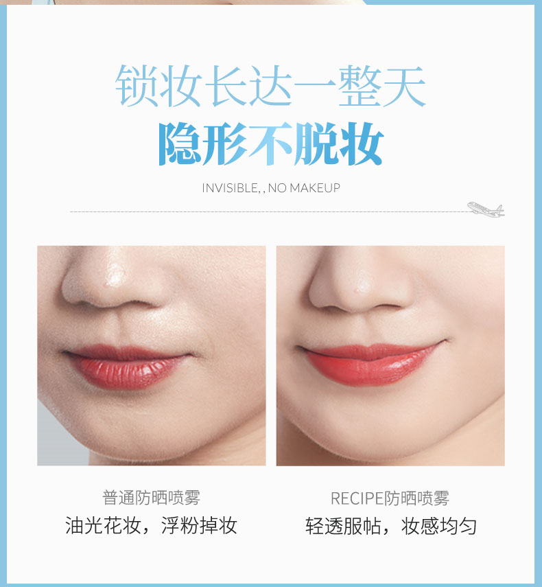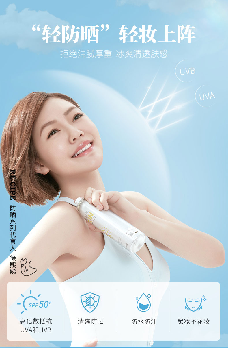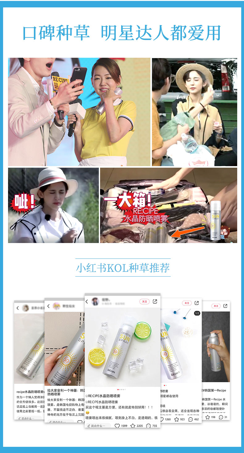RECIPE 水晶防晒喷雾,在《花儿与少年》的节目中,娜扎用的就是这款防晒喷雾。年度明星单品,不含化妆品类10种传统的有害物质,获得了食品标准级的韩国国立农产品认证局的有机产品认证书,通过了敏感性皮肤和无过敏测试,孕妇和儿童也可放心使用。