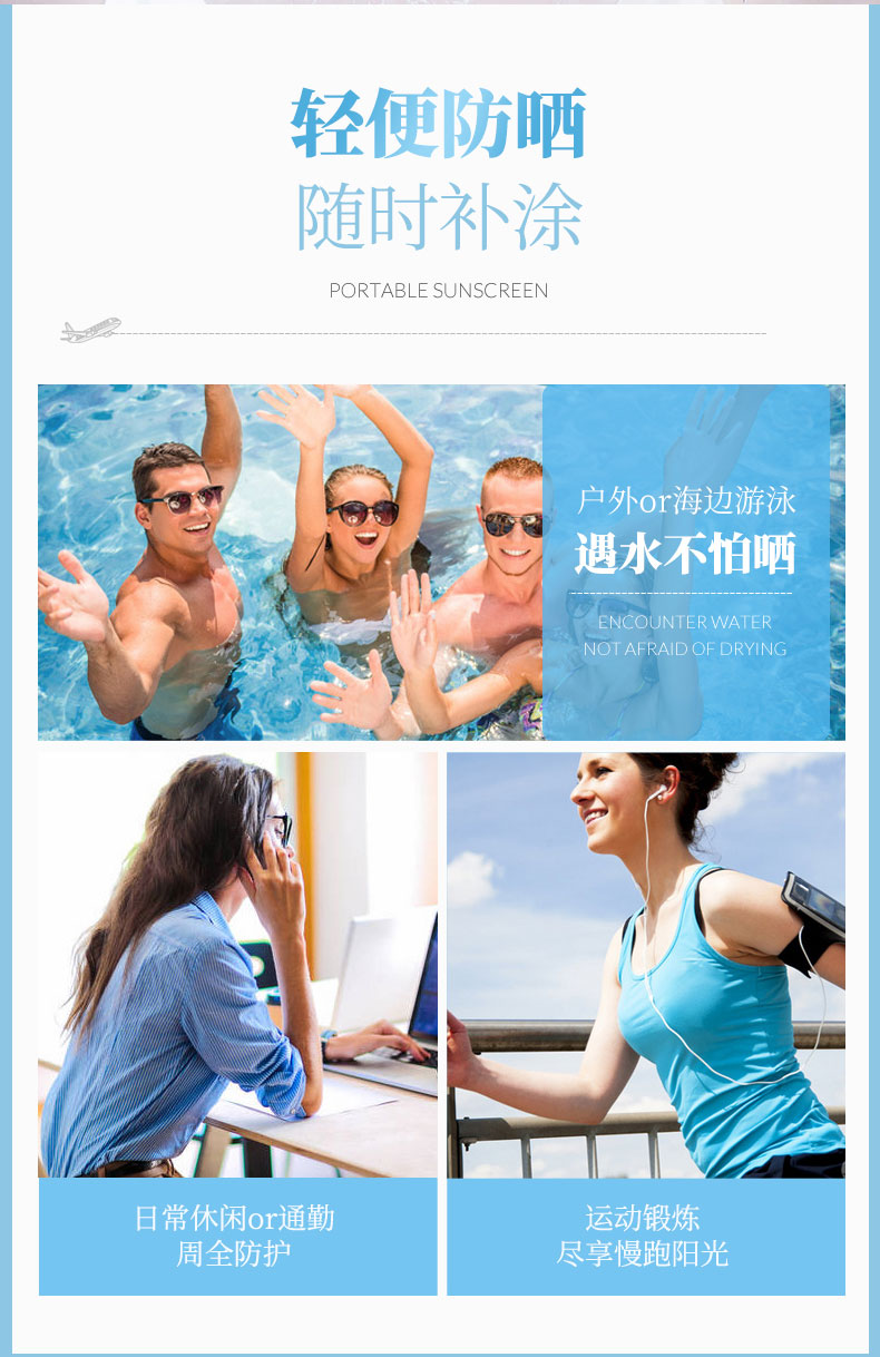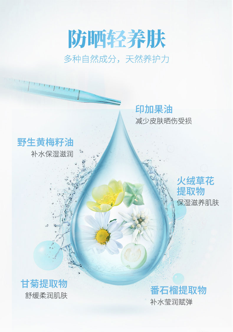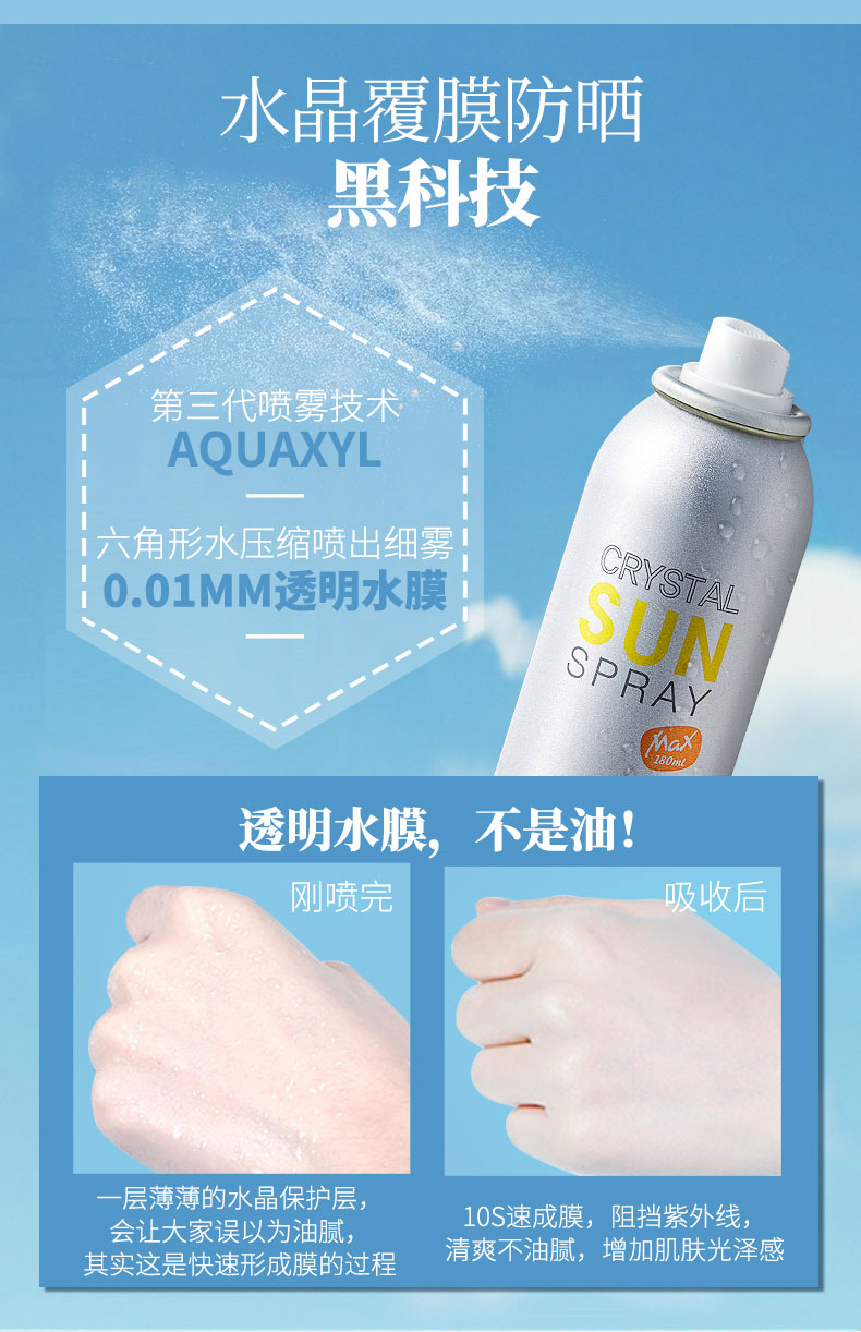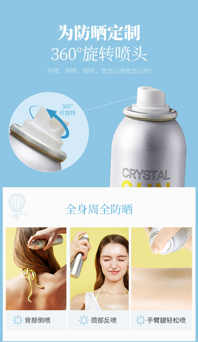 拥有高防晒指数SPF50+PA+++,是目前世界最高防晒指数,防晒时间长达12小时,有着如羽毛般轻盈的质地,丝毫没有浮白迹象,360度自由喷湿的设计,脸部及全身均可无死角方便使用。蕴含有多种自然成分,防晒之余也具备补水、保湿、滋润、修护、效果,皮肤表面快速成膜,防水防汗清爽不油腻,隐形不脱妆,长达一整天。