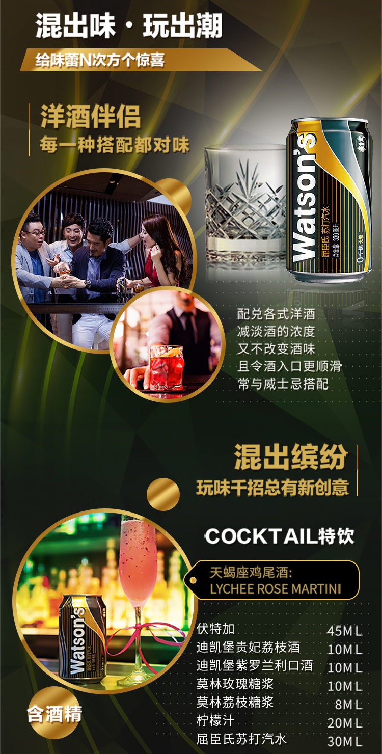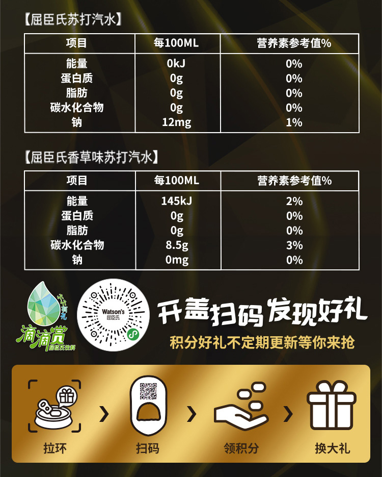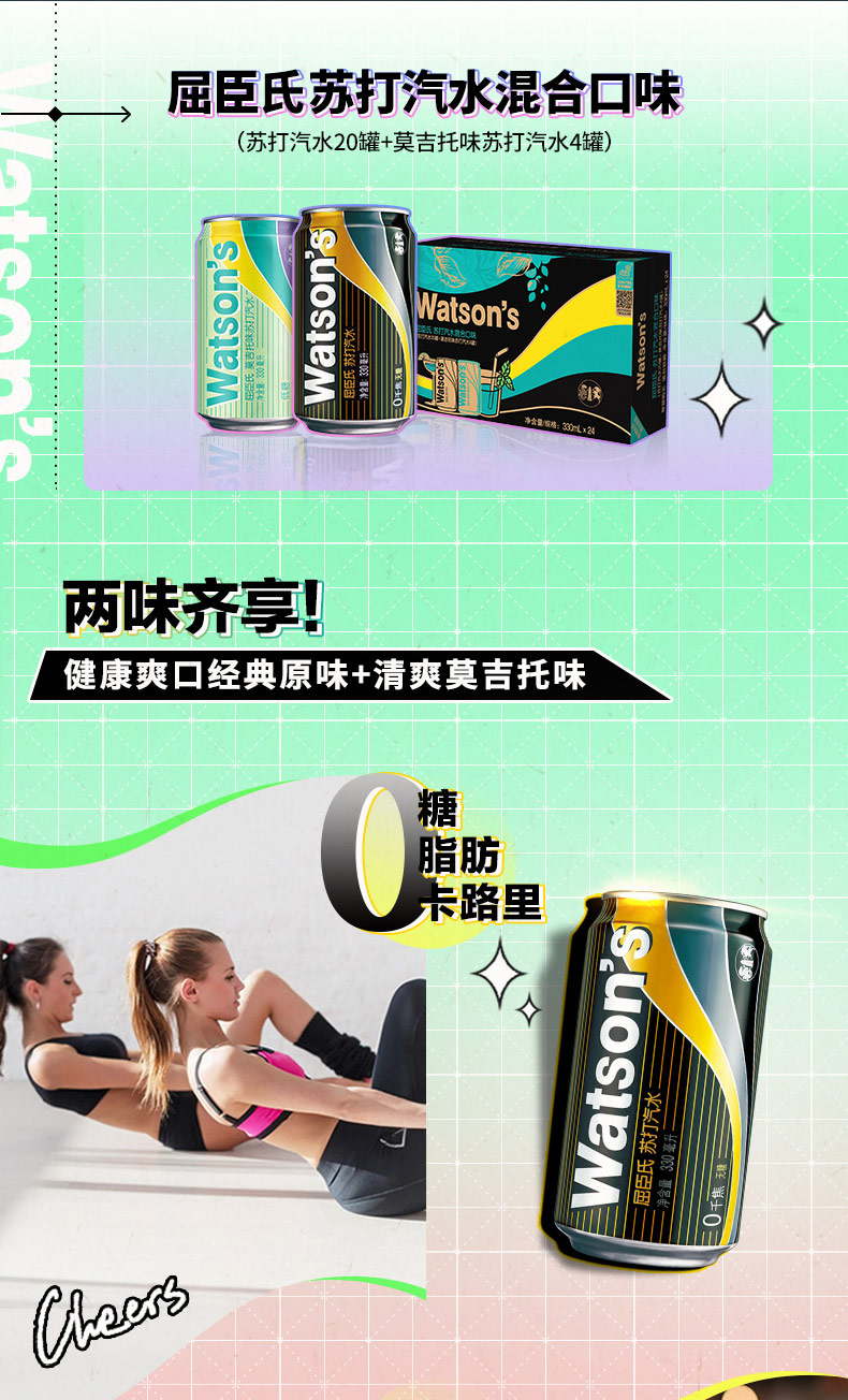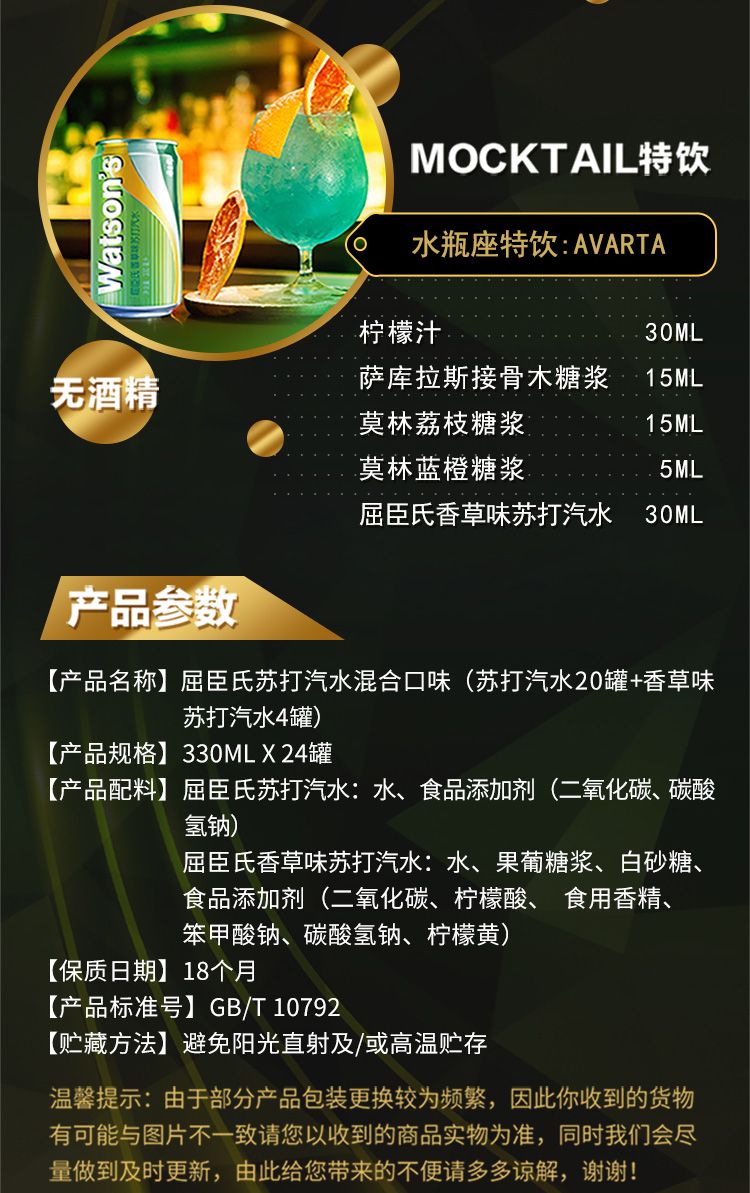 这款苏打水属于碳酸饮料,在经过纯化的饮用水中压入二氧化碳气体制成,是弱碱性水溶液。香草清香,气泡丰富,口感清爽,净饮推荐,也可以作为调制酒水和饮品的原料。规格:330ml*24听。