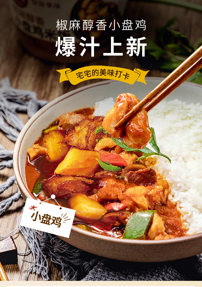 有三杯鸡、小盘鸡、奶油鸡肉咖喱、番茄鸡肉咖喱、韩式泡菜五花肉、香菇卤肉、黄焖鸡米、黑椒牛柳、8种口味可选。