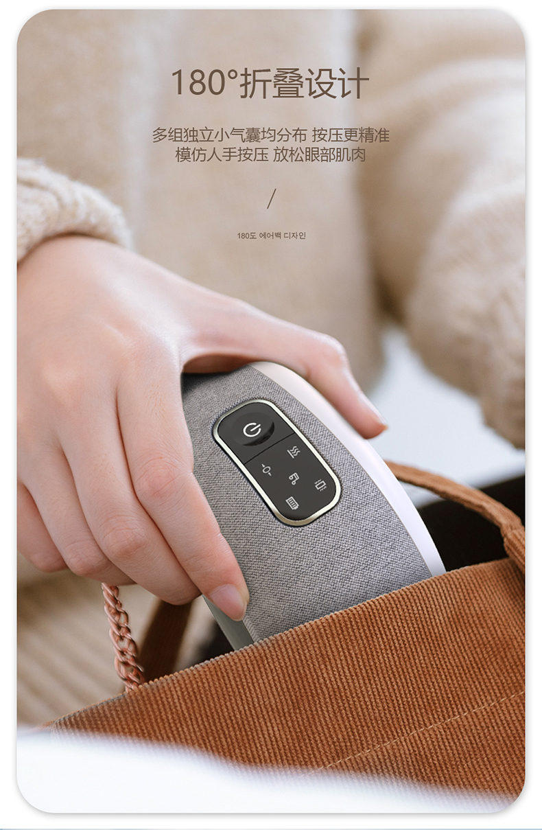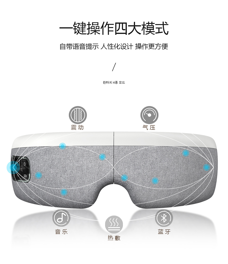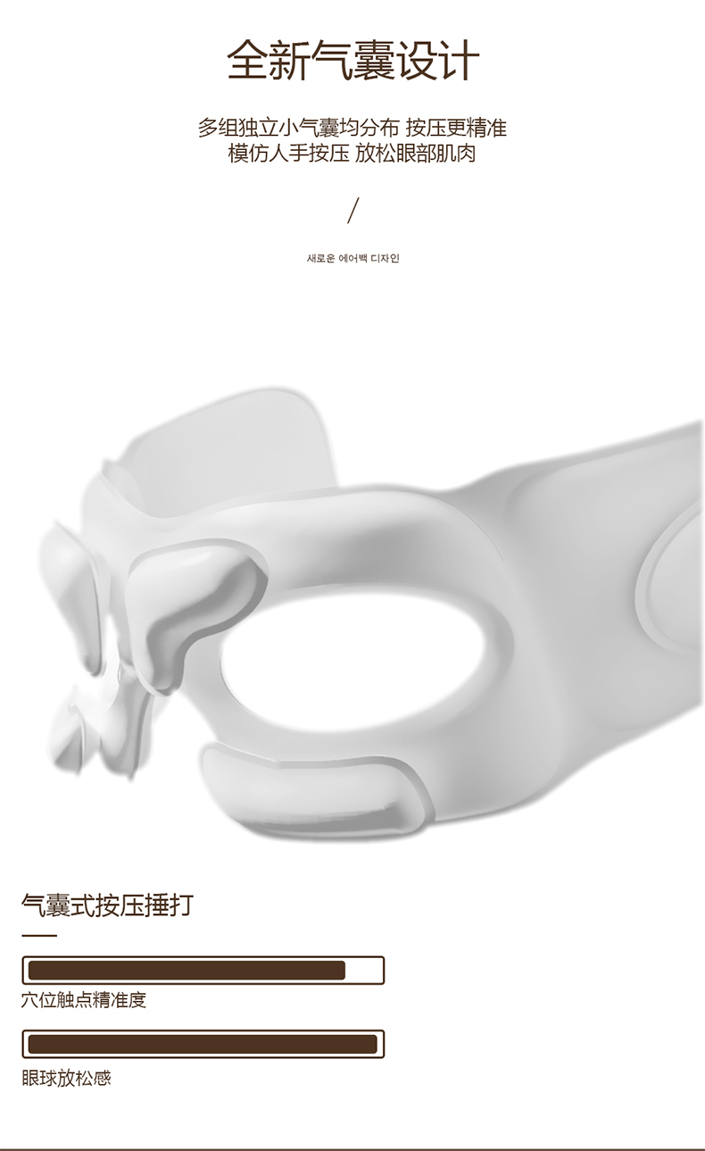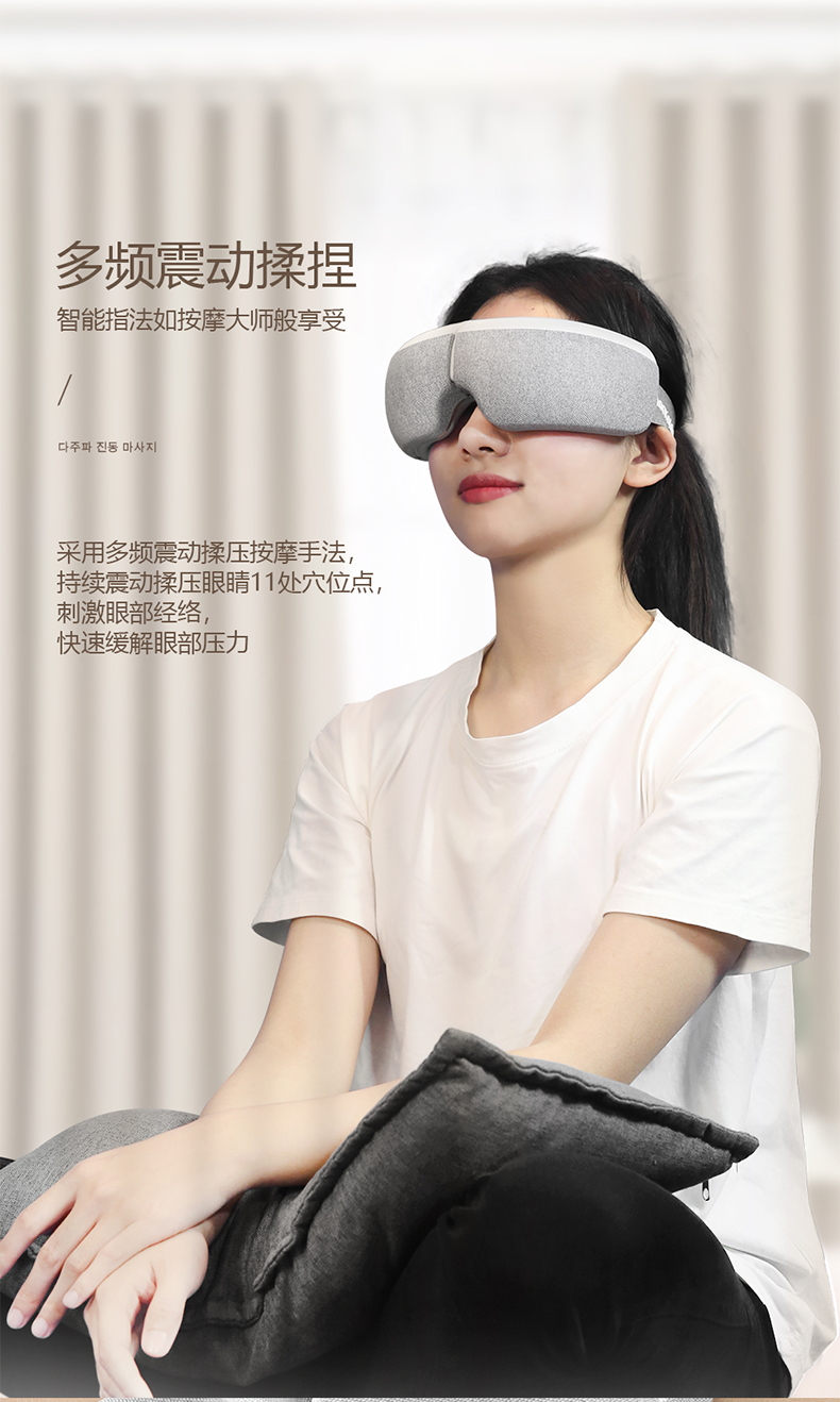 全气囊包裹,根据眼部轮廓多组气囊均匀分布,定点分布在太阳穴、鱼腰穴、攒竹穴等重要穴位,双马达的配置让按摩力度更均匀,模拟推拿、颤动、锤击、指压、滚转等六种传统按摩手法, 促进血液循环,使睫状肌、六条肌增加弹性,缓解眼球酸涩胀痛,增加眼球活力,按摩更到位。